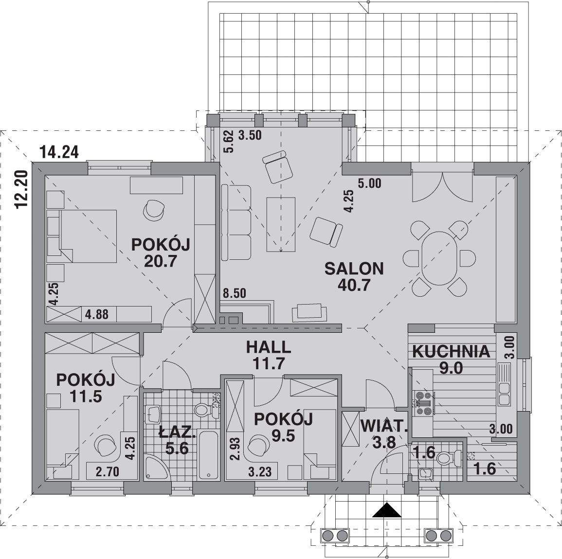 Graficzne opracowanie rzutów poglądowych widocznych na karcie projektu zostało wykonane przez Extradom.pl. Prezentowane przez Extradom.pl wizualizacje wykonane zostały przez autora projektu i należy poczytywać je jedynie za przykład i propozycję wykończenia, wizję architektoniczną autora projektu. Ostateczne wykończenie budynku może nastąpić na wiele sposobów. Szczegółowe rozwiązania zastosowane w oferowanej dokumentacji - w tym również ilość, lokalizacje i wygląd okien, drzwi, kominów - mogą w niewielkim stopniu różnić się od prezentowanej wizualizacji budynku.