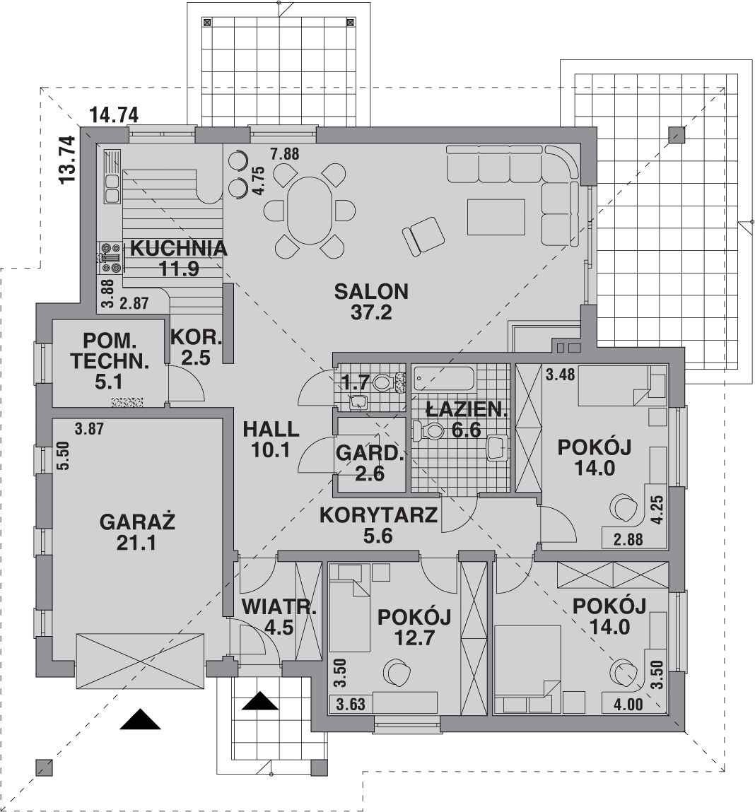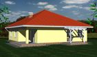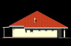 Graficzne opracowanie rzutów poglądowych widocznych na karcie projektu zostało wykonane przez Extradom.pl. Prezentowane przez Extradom.pl wizualizacje wykonane zostały przez autora projektu i należy poczytywać je jedynie za przykład i propozycję wykończenia, wizję architektoniczną autora projektu. Ostateczne wykończenie budynku może nastąpić na wiele sposobów. Szczegółowe rozwiązania zastosowane w oferowanej dokumentacji - w tym również ilość, lokalizacje i wygląd okien, drzwi, kominów - mogą w niewielkim stopniu różnić się od prezentowanej wizualizacji budynku.