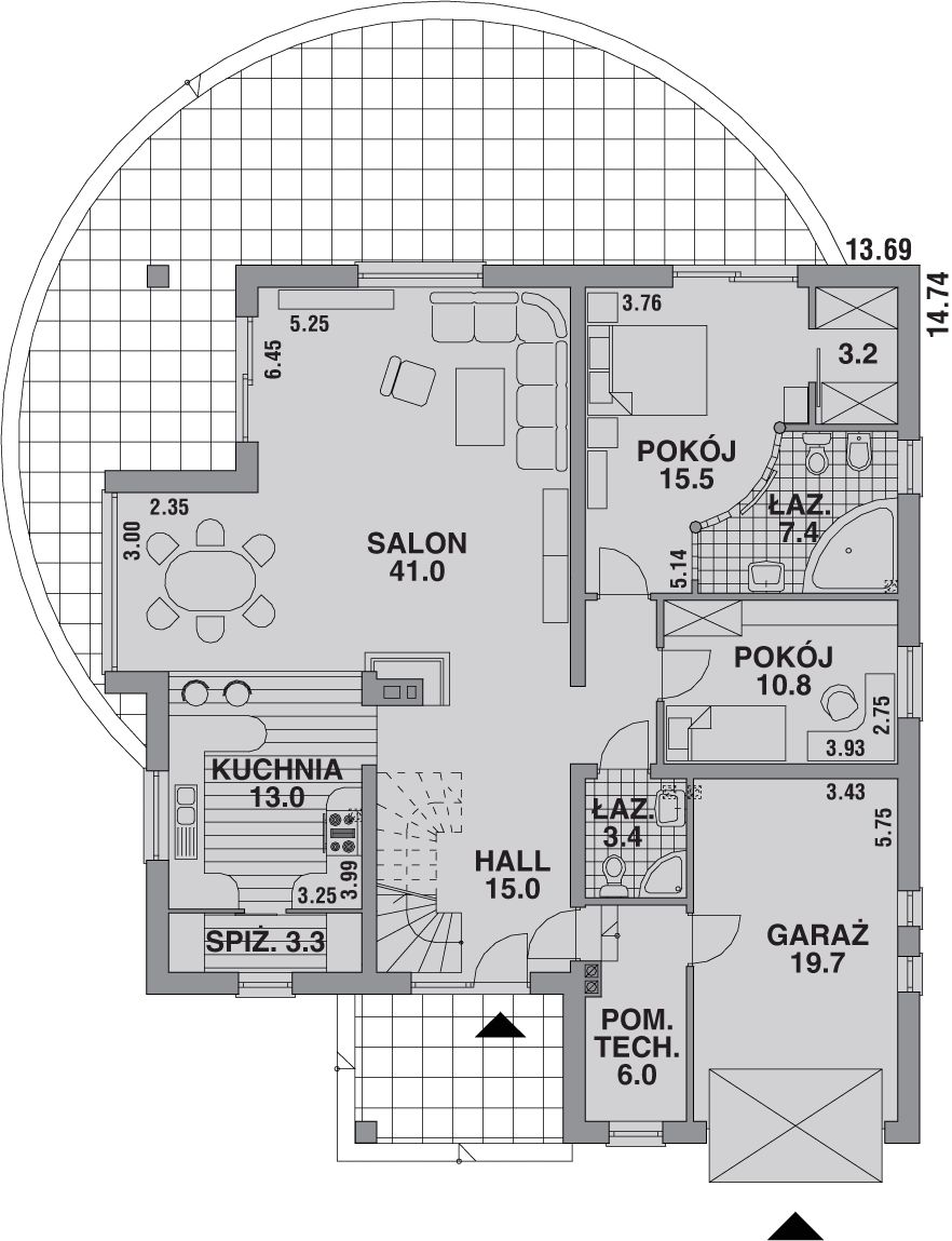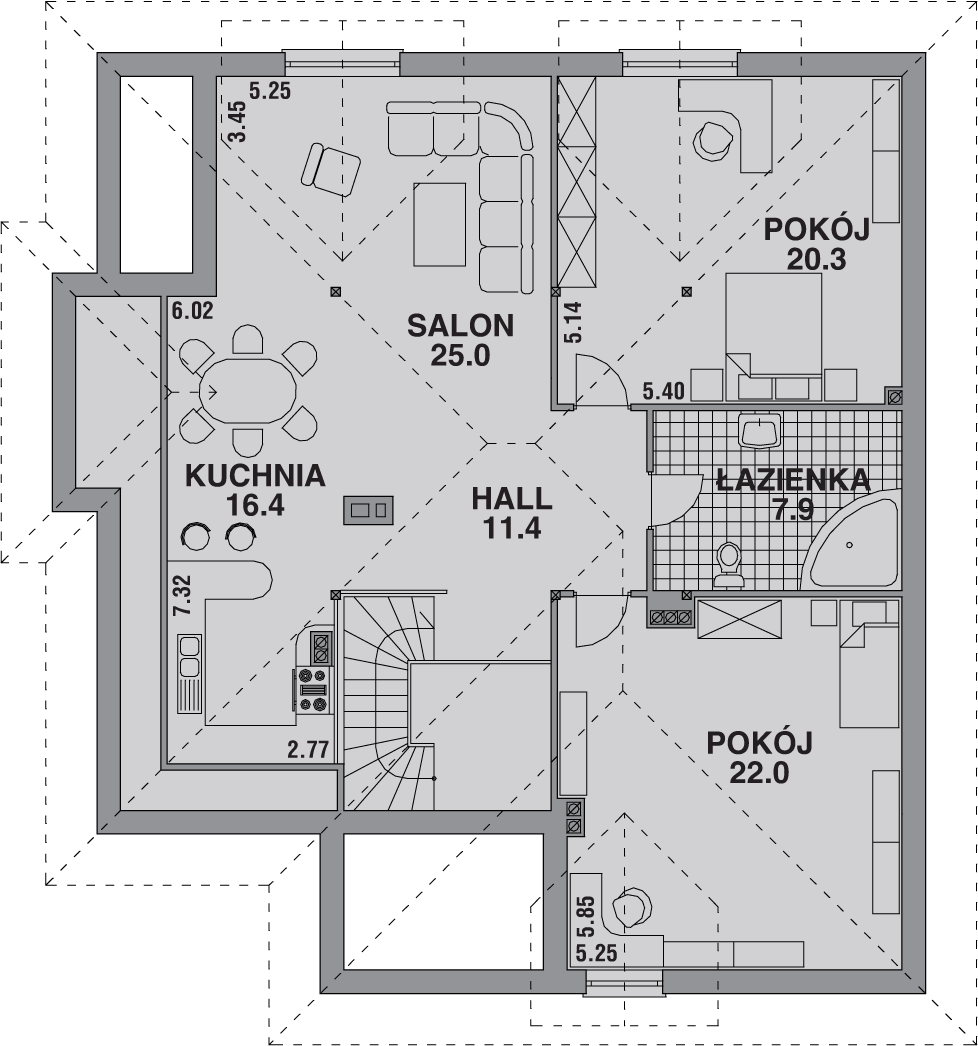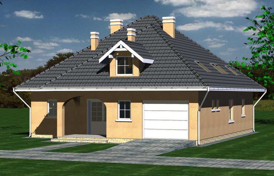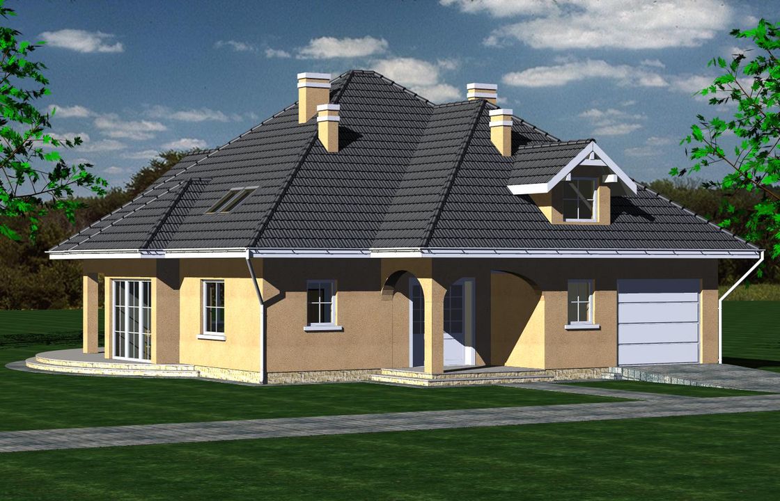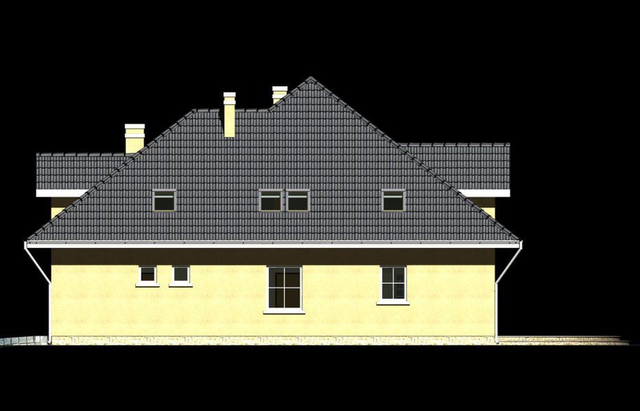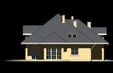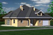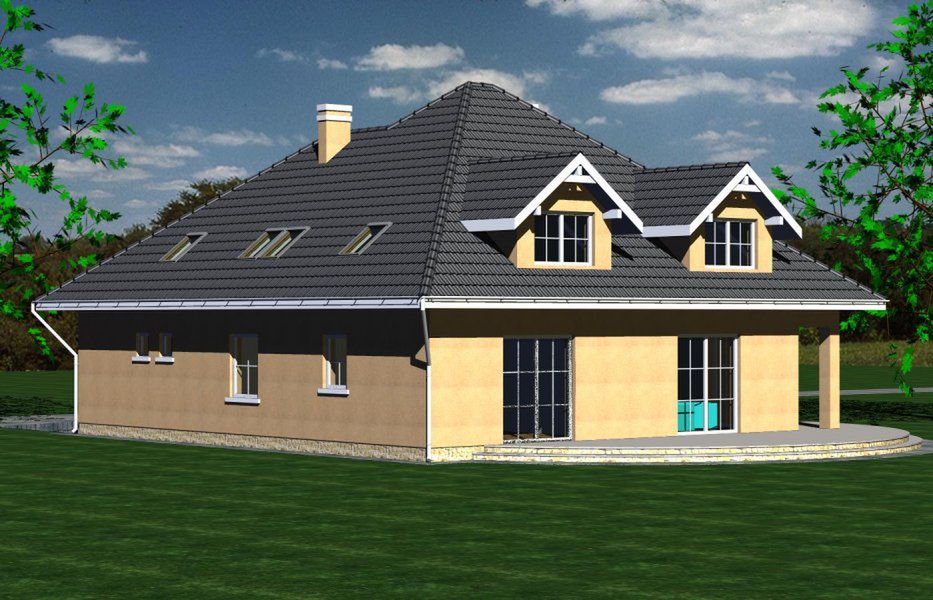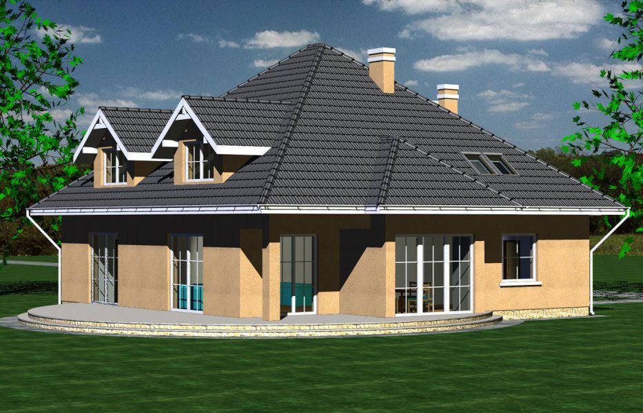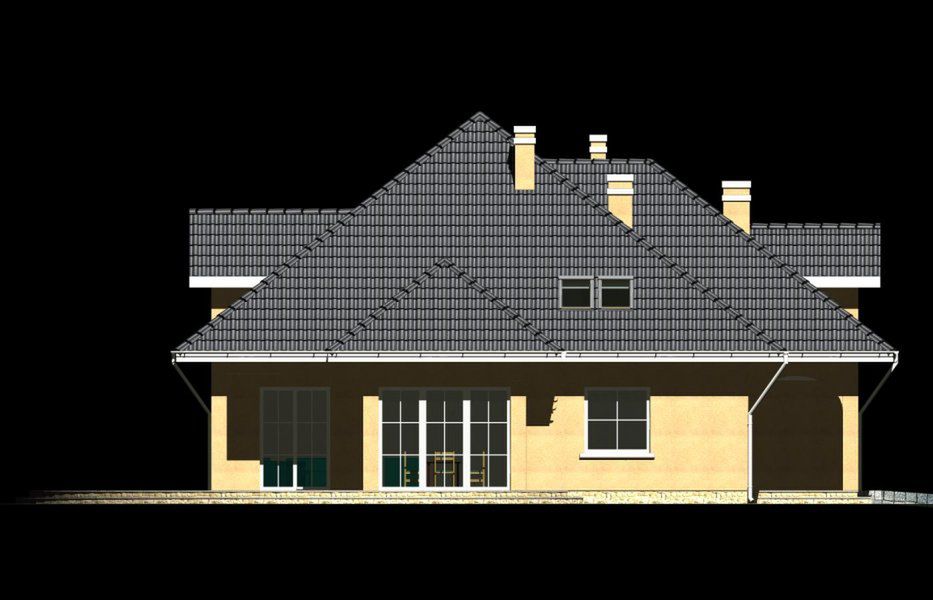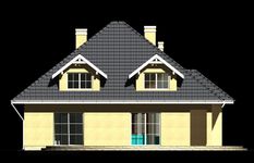 Graficzne opracowanie rzutów poglądowych widocznych na karcie projektu zostało wykonane przez Extradom.pl. Prezentowane przez Extradom.pl wizualizacje wykonane zostały przez autora projektu i należy poczytywać je jedynie za przykład i propozycję wykończenia, wizję architektoniczną autora projektu. Ostateczne wykończenie budynku może nastąpić na wiele sposobów. Szczegółowe rozwiązania zastosowane w oferowanej dokumentacji - w tym również ilość, lokalizacje i wygląd okien, drzwi, kominów - mogą w niewielkim stopniu różnić się od prezentowanej wizualizacji budynku.