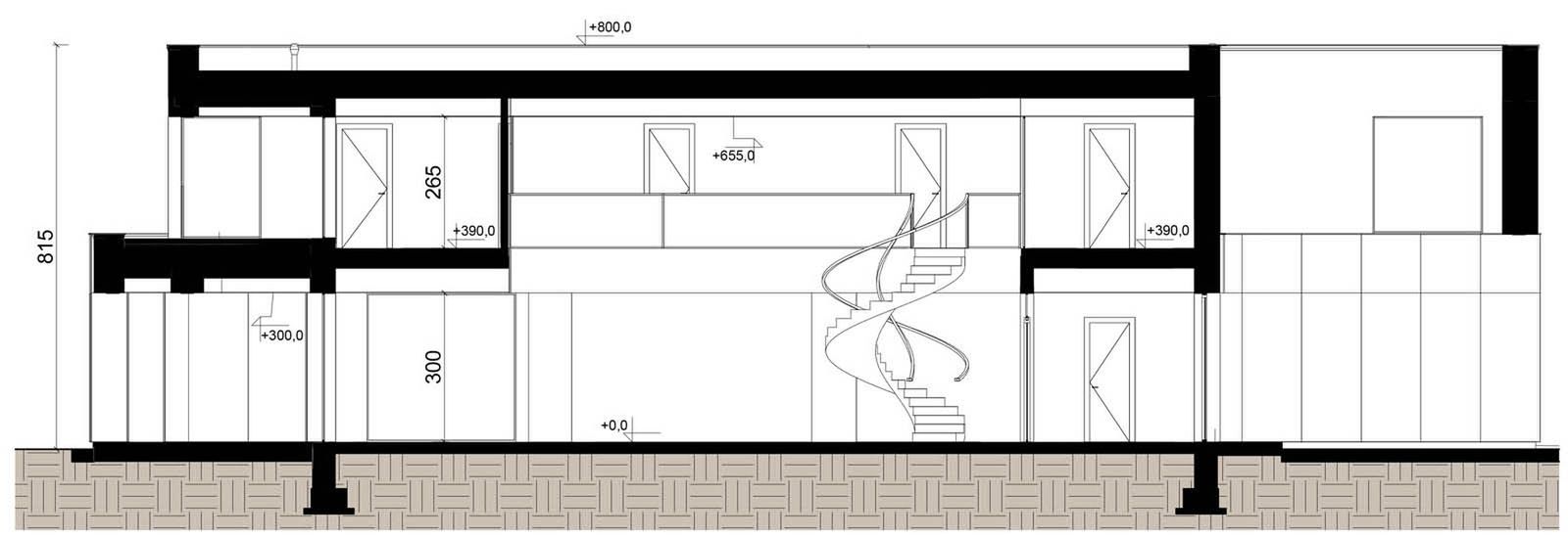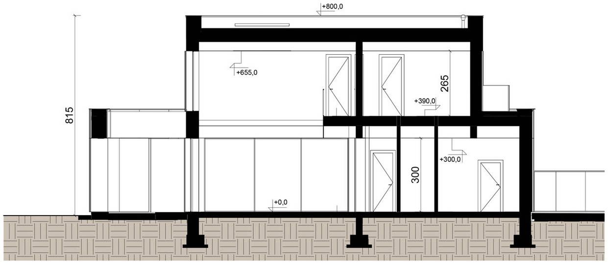 Posadowienie: ławy fundamentowe; Ściany zewnętrzne: bloczki silikatowe 24cm, Wełna mineralna 25 cm, spieki kwarcowe / tynk; Strop i stropodach: monolityczny żelbetowy, pokrycie membrana EPDM;