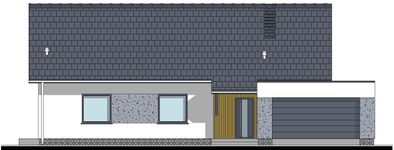 Ściany: bloczek z betonu komórkowego klasy M600 o grubości 24cm. Styropian EPS 70 o grubości 20cm, np. firmy Swisspor. Strop: w projekcie zaprojektowano strop drewniany wykończony sufitem podwieszanym z płyt g.-k. na ruszcie aluminiowym. Dach nad częścią mieszkalną: dwuspadowy, więźba drewniana w technologii tradycyjnej, nachylenie 30st. pokrycie z dachówki ceramicznej. Dach nad garażem: płaski stropodach o konstrukcji gęstożebrowej TERIVA 4,0/1 o gr. 24cm. Elewacje: tynk cienkowarstwowy, cokół z płytek klinkierowych. Elementy dekoracyjne elewacji ściennej z betonu architektonicznego i paneli drewnianych. Ogrzewanie: W projekcie zastosowano kocioł na paliwo gazowe. Istnieje możliwość zamiany kotła na inne paliwo na etapie adaptacji. Ogrzewanie podłogowe: zaprojektowano w takich pomieszczeniach jak: korytarze, łazienki, kuchnia, salon. Wentylacja: W projekcie zastosowano wentylację mechaniczną - rekuperację. Chcesz wentylację grawitacyjną? Napisz do nas!.