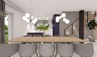 Ściany: bloczek z betonu komórkowego klasy M600 o grubości 24cm. Styropian EPS 70 o grubości 20cm, np. firmy Swisspor. Strop: w projekcie zaprojektowano strop podwieszany z płyt g-k na ruszcie aluminiowym, ocieplony wełna mineralną o gr. min. 30cm. Dach: dwuspadowy i płaski nad garażem, więźba z wiązarów prefabrykowanych, nachylenie 30st., dachówka ceramiczna. Elewacje: tynk cienkowarstwowy, cokół z płytek klinkierowych. Elementy dekoracyjne elewacji ściennej z betonu architektonicznego. Ogrzewanie: zastosowano kocioł na pellet. Istnieje możliwość zmiany ogrzewania. Napisz do nas!. Ogrzewanie podłogowe: zaprojektowano w takich pomieszczeniach jak: korytarze, łazienki, kuchnia, salon. Wentylacja: W projekcie jako podstawową wentylację zaprojektowano wentylację grawitacyjną. Dodatkowo do projektu dołączamy gratis projekt wentylacji mechanicznej- rekuperacji. Na etapie adaptacji projektu należy wybrać jedną z dwóch opcji.