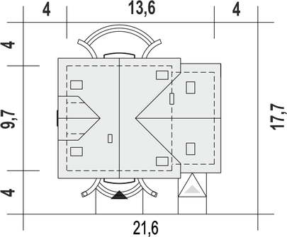 Graficzne opracowanie rzutów poglądowych widocznych na karcie projektu zostało wykonane przez Extradom.pl. Prezentowane przez Extradom.pl wizualizacje wykonane zostały przez autora projektu i należy poczytywać je jedynie za przykład i propozycję wykończenia, wizję architektoniczną autora projektu. Ostateczne wykończenie budynku może nastąpić na wiele sposobów. Szczegółowe rozwiązania zastosowane w oferowanej dokumentacji - w tym również ilość, lokalizacje i wygląd okien, drzwi, kominów - mogą w niewielkim stopniu różnić się od prezentowanej wizualizacji budynku.