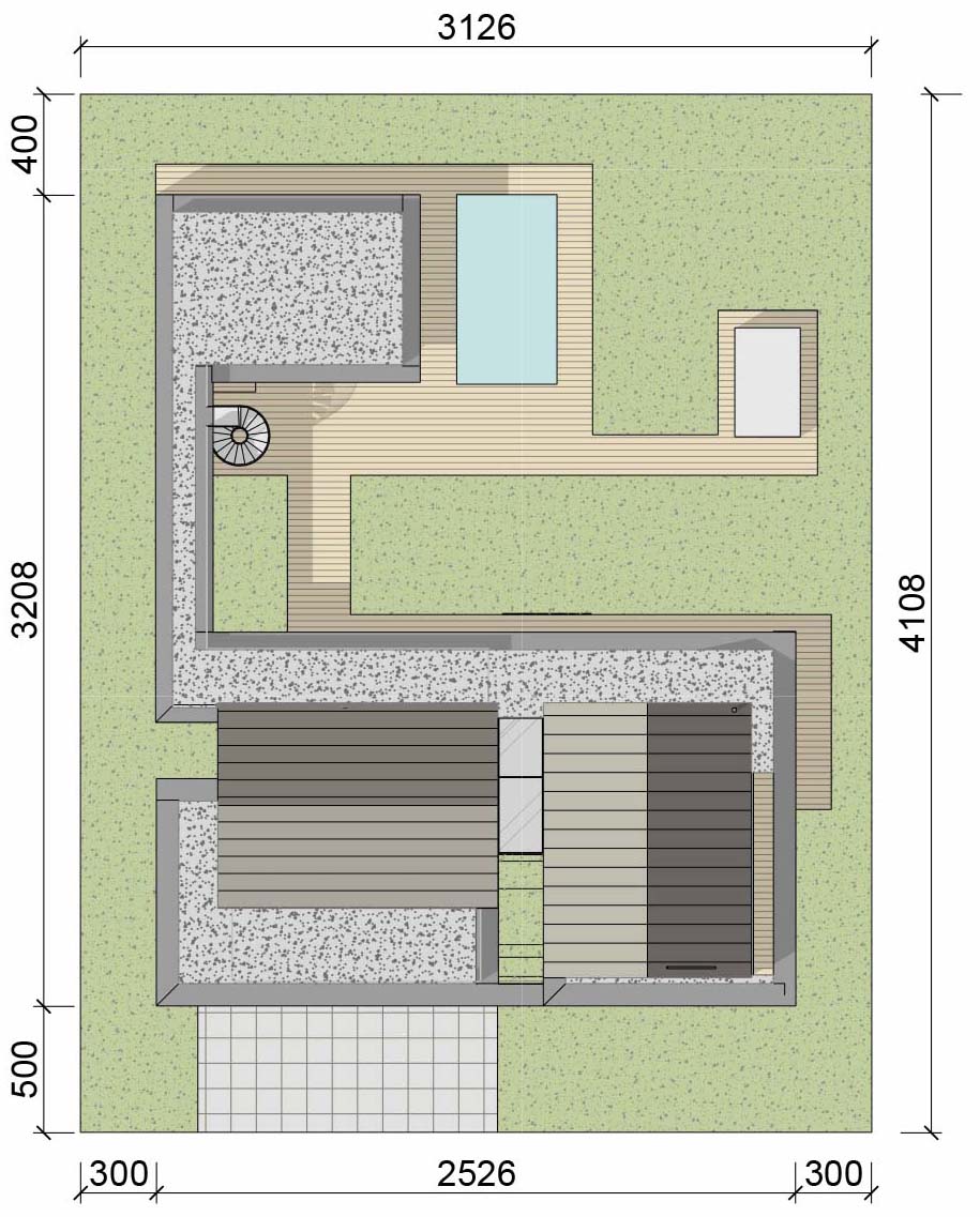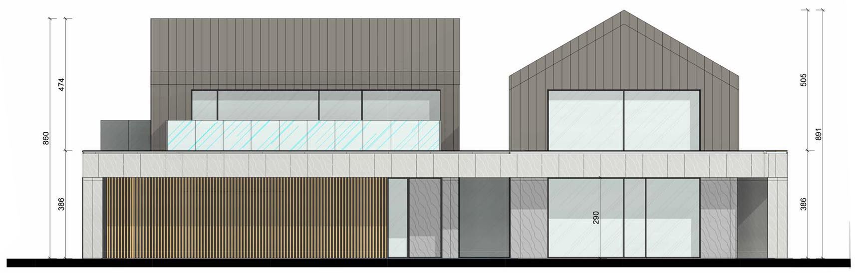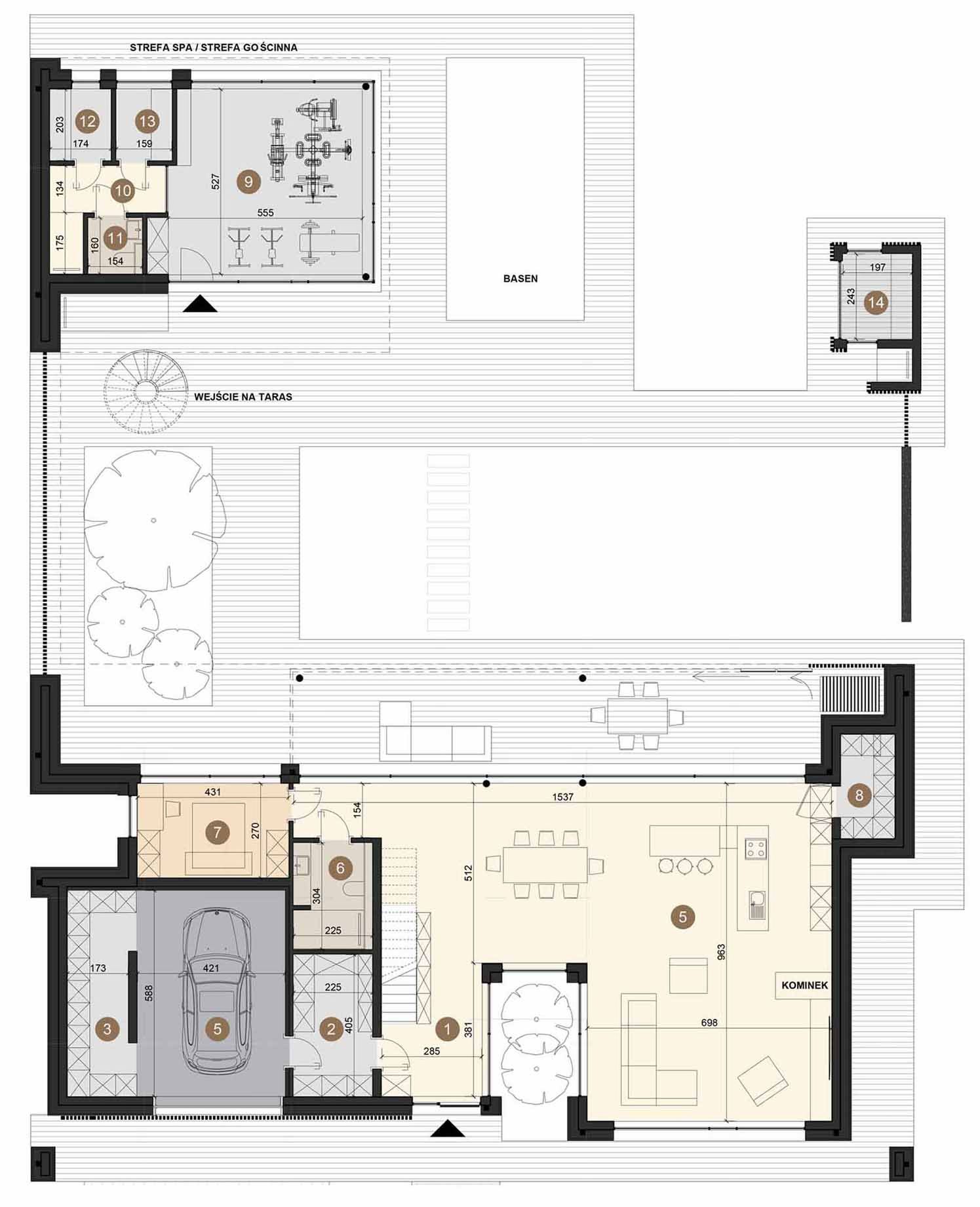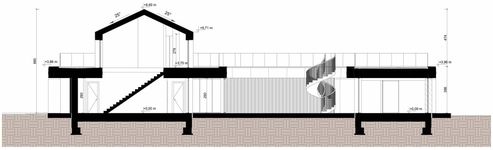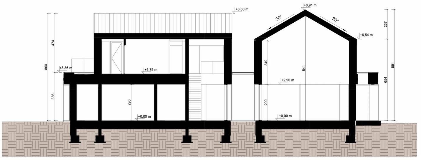Posadowienie: ławy fundamentowe. Ściany zewnętrzne: bloczki silikatowe 24cm, wełna mineralna 20 cm, spieki kwarcowe, drewno elewacyjne, blacha na rąbek Strop i stropodach): monolityczny żelbetowy, pokrycie membrana EPDM Konstrukcja dachu: drewniana więźba dachowa krokwiowo – jętkowa Pokrycie dachu: blacha na rąbek stojący Kąt nachylenia dachu to 25 i 30 stopni, stropodachu to 1%.