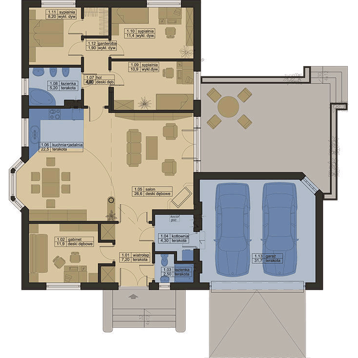 Graficzne opracowanie rzutów poglądowych widocznych na karcie projektu zostało wykonane przez Extradom.pl. Prezentowane przez Extradom.pl wizualizacje wykonane zostały przez autora projektu i należy poczytywać je jedynie za przykład i propozycję wykończenia, wizję architektoniczną autora projektu. Ostateczne wykończenie budynku może nastąpić na wiele sposobów. Szczegółowe rozwiązania zastosowane w oferowanej dokumentacji - w tym również ilość, lokalizacje i wygląd okien, drzwi, kominów - mogą w niewielkim stopniu różnić się od prezentowanej wizualizacji budynku.