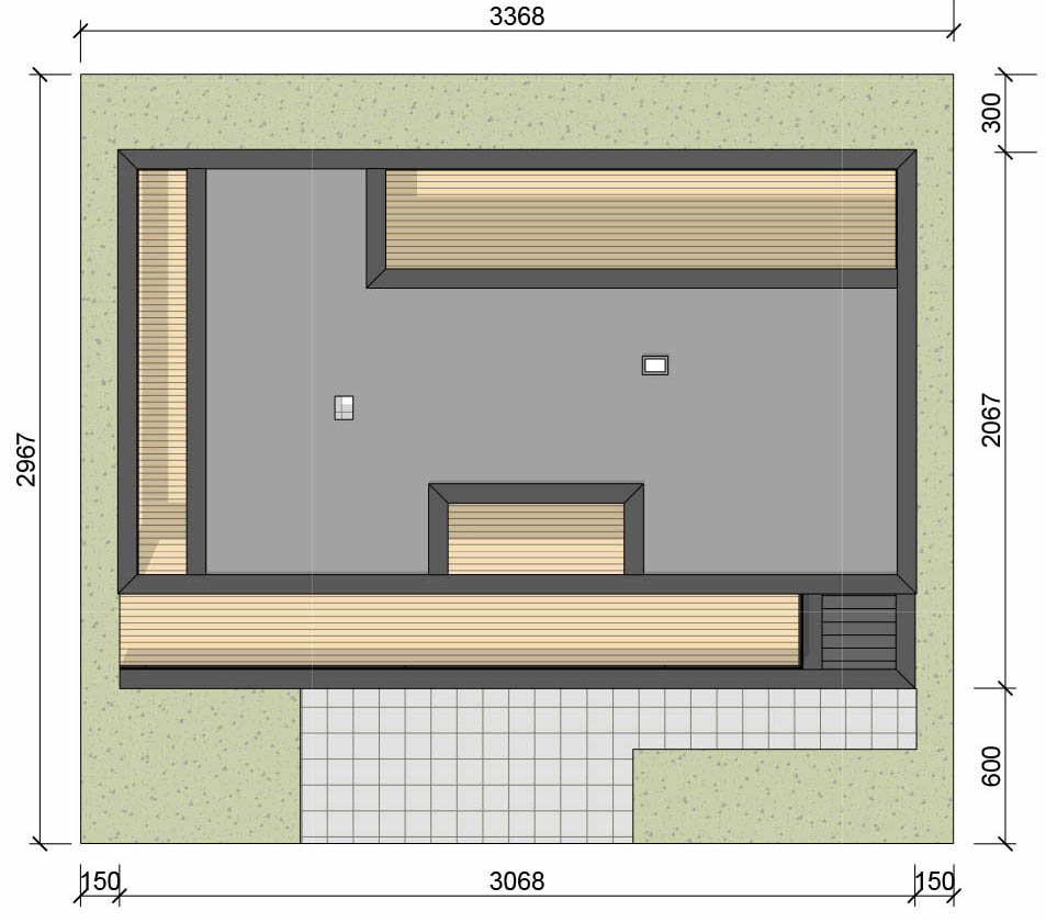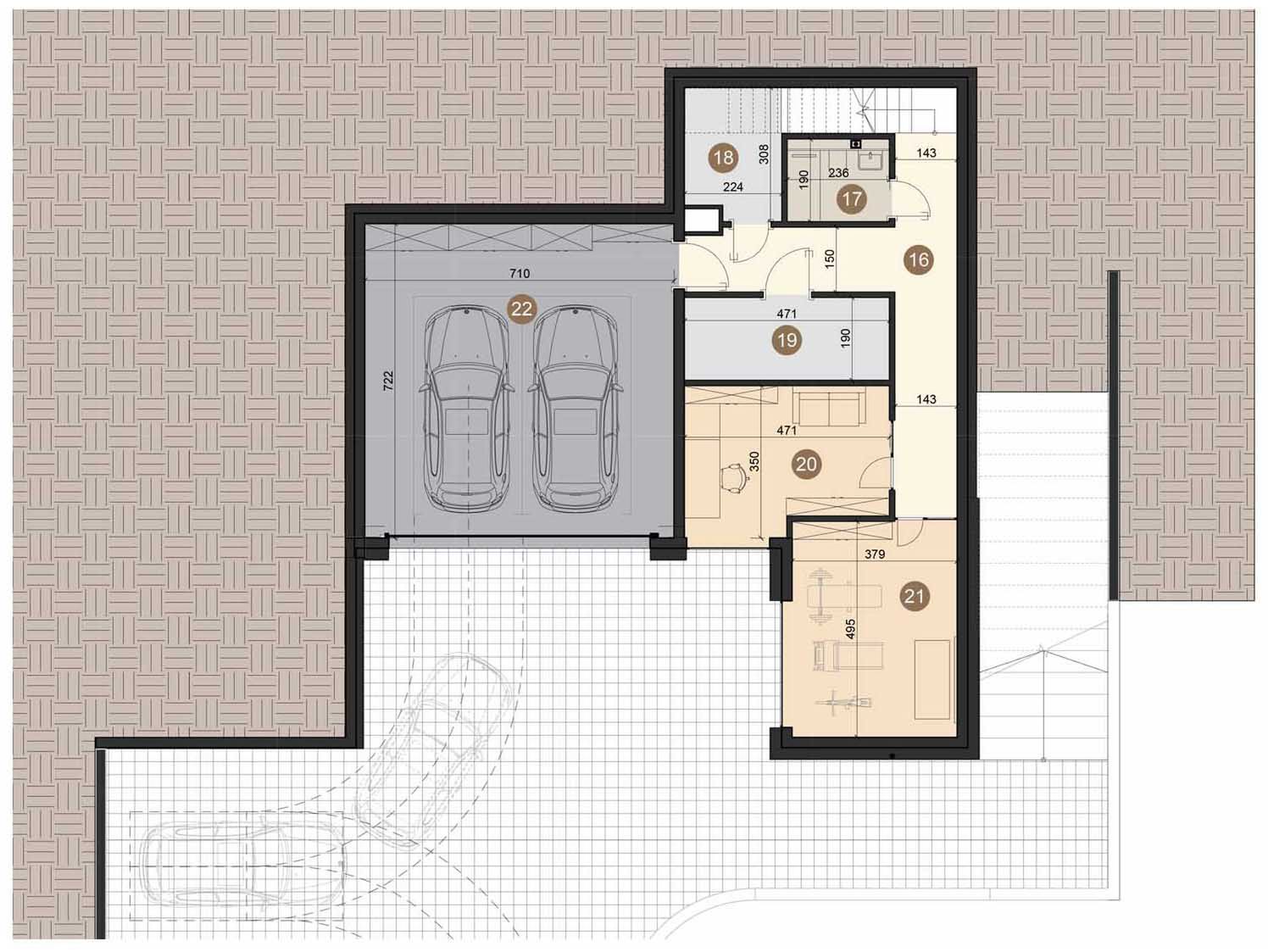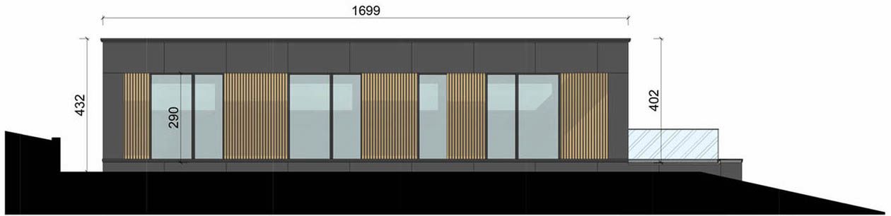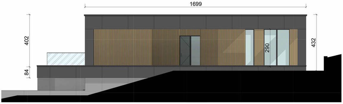 Posadowienie: płyta fundamentowa Ściany zewnętrzne: bloczki silikatowe 24cm, Wełna mineralna 25 cm, spieki kwarcowe / drewno elewacyjne Strop i stropodach: monolityczny żelbetowy, pokrycie membrana EPDM