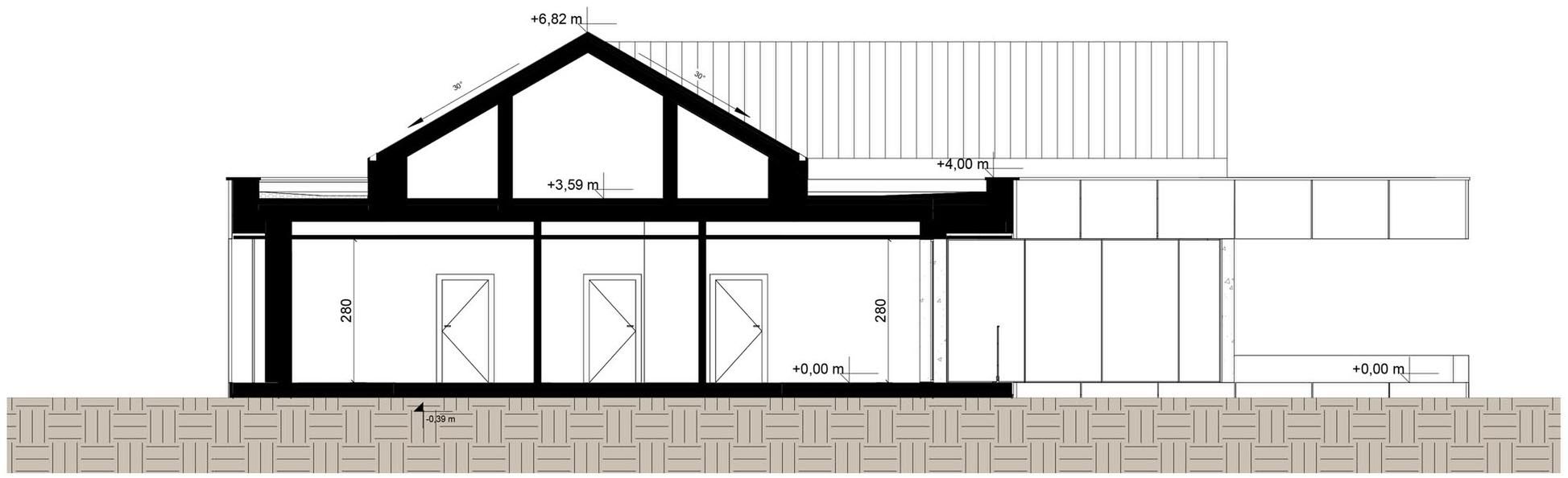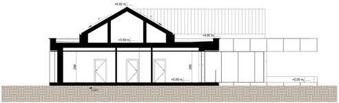Posadowienie: ławy fundamentowe. Ściany zewnętrzne: bloczki silikatowe 24cm, Styropian 25 cm / wełna mineralna 25 cm, tynk elewacyjny / spieki kwarcowe / drewno elewacyjne. Strop i stropodach): monolityczny żelbetowy, pokrycie papa. Konstrukcja dachu: drewniana więźba dachowa krokwiowo – jętkowa. Pokrycie dachu: blacha na rąbek stojący.