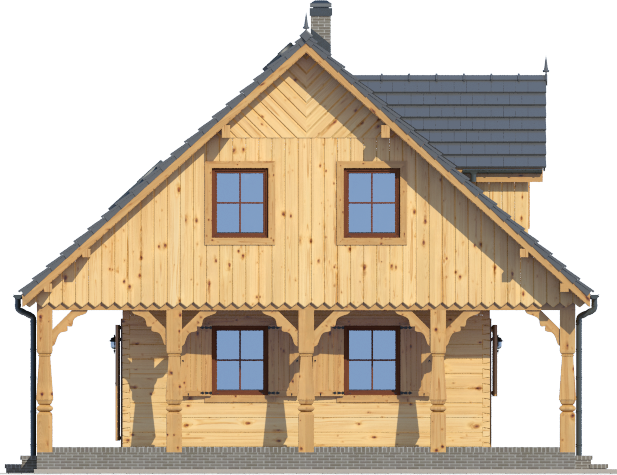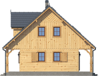 Wysokość ścianki kolankowej: 0.77 m. Ilość drewna na więźbę: 11.9 m³. Strop: drewniany. Pokrycie dachu: dachówka ceramiczna. Ściany zewnętrzne: płazy drewniane + wełna mineralna + deska. Ściany wewnętrzne: płazy drewniane. Typ ogrzewania: elektryczne akumulacyjne + kominkowe.