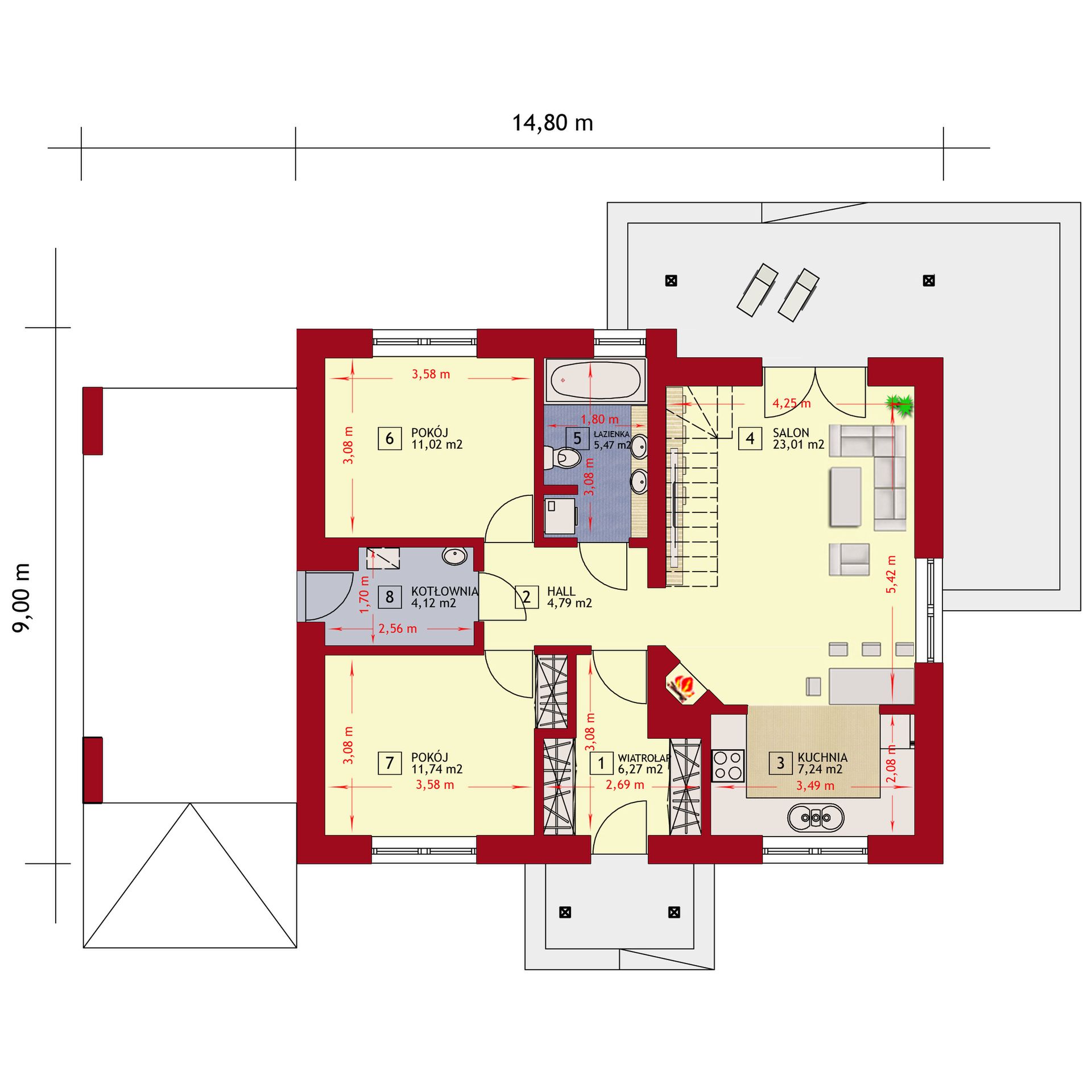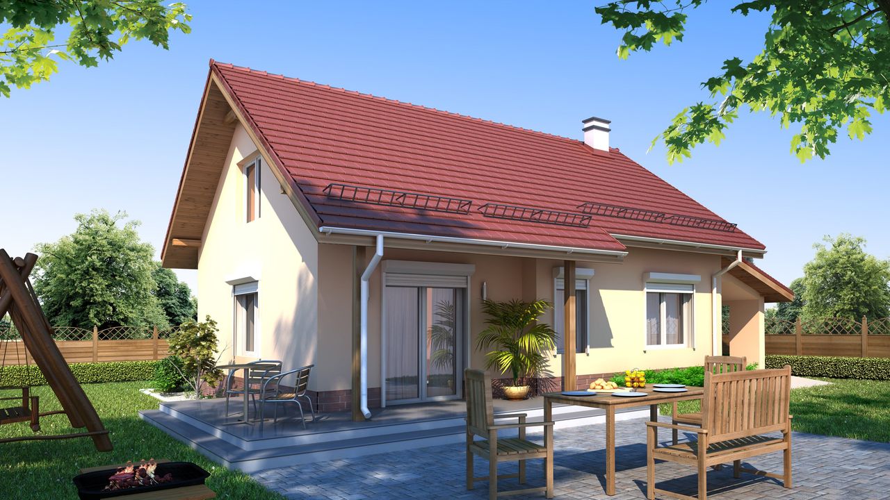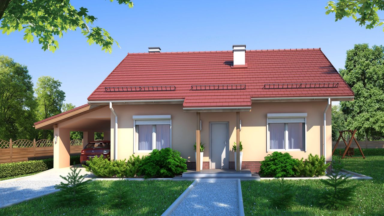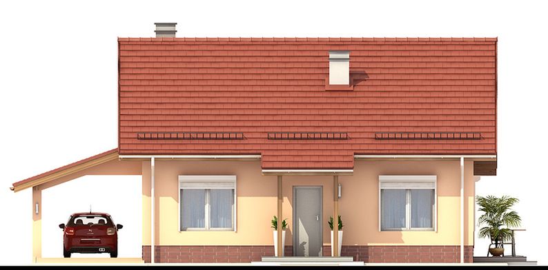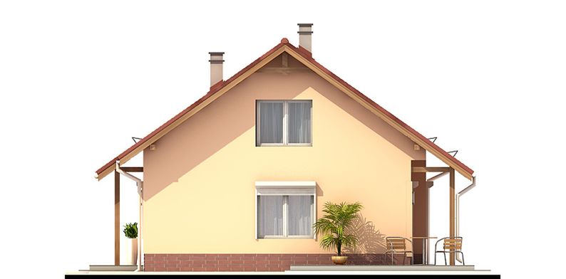 Graficzne opracowanie rzutów poglądowych widocznych na karcie projektu zostało wykonane przez Extradom.pl. Prezentowane przez Extradom.pl wizualizacje wykonane zostały przez autora projektu i należy poczytywać je jedynie za przykład i propozycję wykończenia, wizję architektoniczną autora projektu. Ostateczne wykończenie budynku może nastąpić na wiele sposobów. Szczegółowe rozwiązania zastosowane w oferowanej dokumentacji - w tym również ilość, lokalizacje i wygląd okien, drzwi, kominów - mogą w niewielkim stopniu różnić się od prezentowanej wizualizacji budynku.