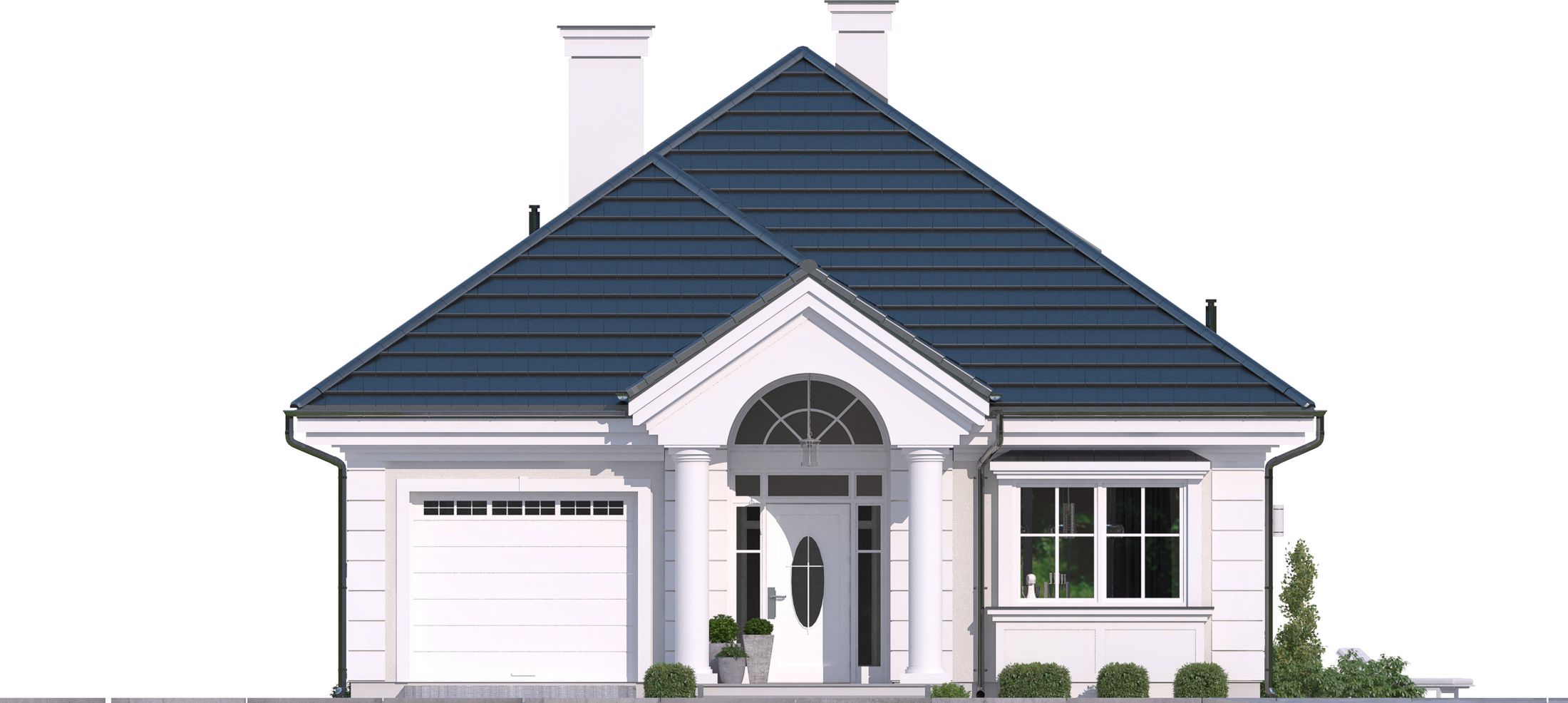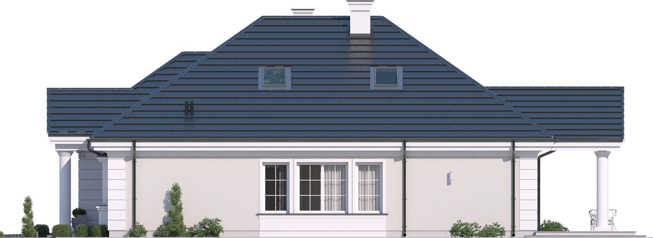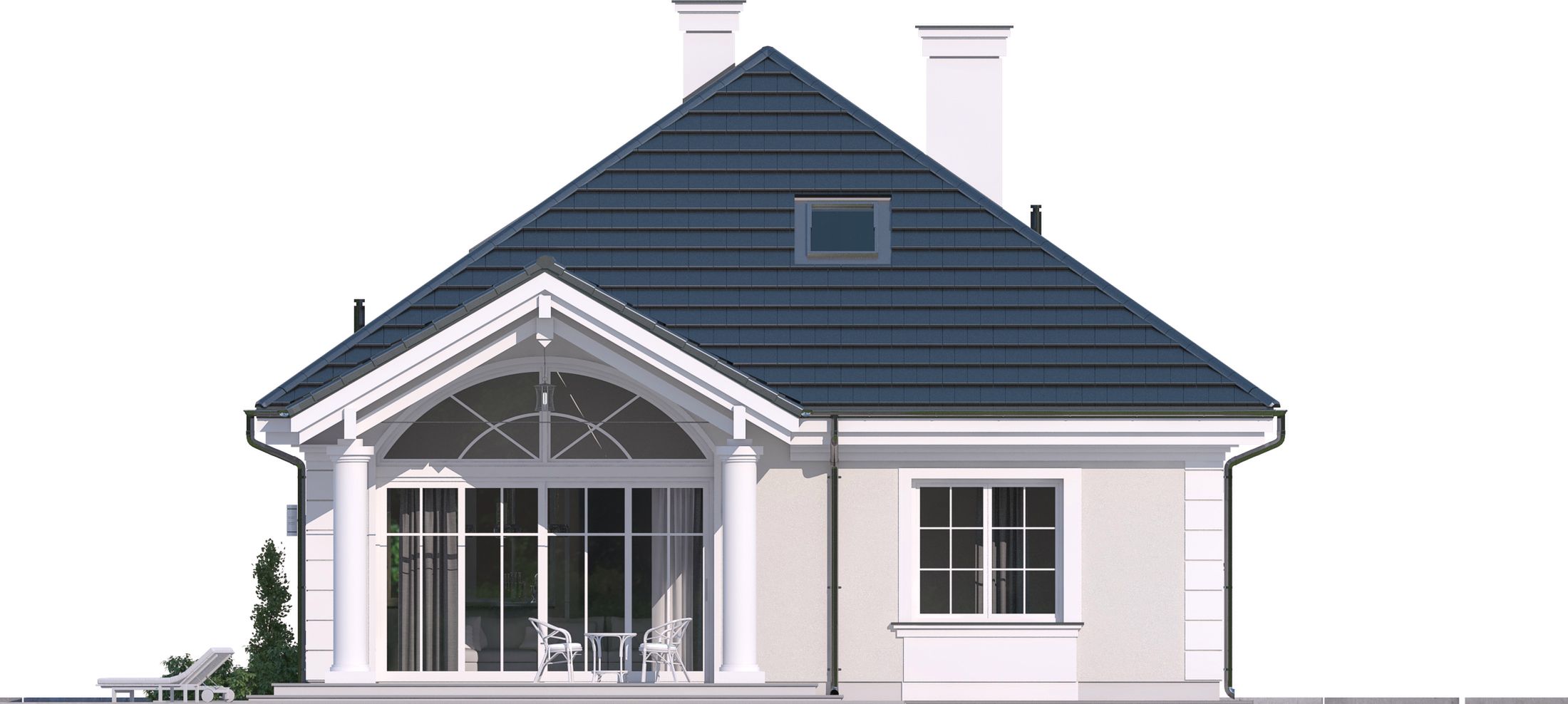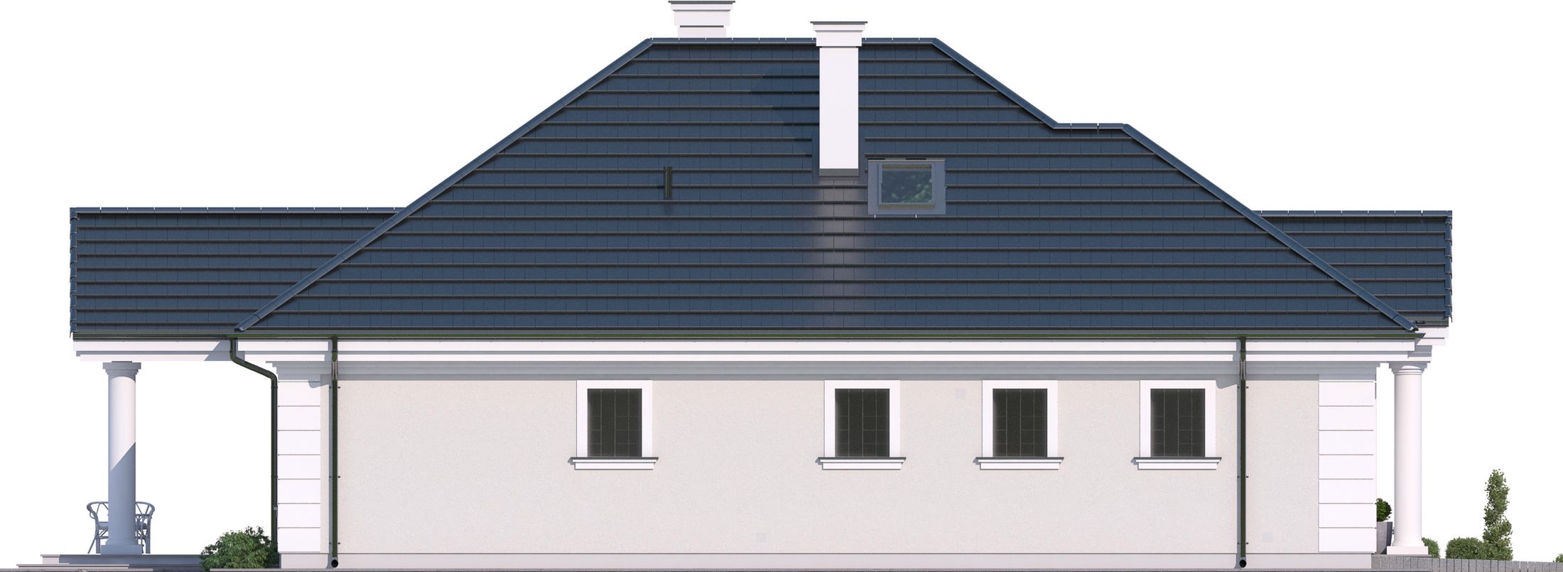 Graficzne opracowanie rzutów poglądowych widocznych na karcie projektu zostało wykonane przez Extradom.pl. Prezentowane przez Extradom.pl wizualizacje wykonane zostały przez autora projektu i należy poczytywać je jedynie za przykład i propozycję wykończenia, wizję architektoniczną autora projektu. Ostateczne wykończenie budynku może nastąpić na wiele sposobów. Szczegółowe rozwiązania zastosowane w oferowanej dokumentacji - w tym również ilość, lokalizacje i wygląd okien, drzwi, kominów - mogą w niewielkim stopniu różnić się od prezentowanej wizualizacji budynku.