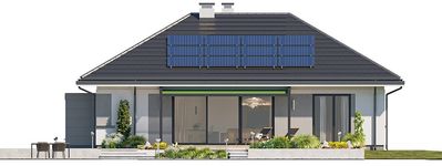 Graficzne opracowanie rzutów poglądowych widocznych na karcie projektu zostało wykonane przez Extradom.pl. Prezentowane przez Extradom.pl wizualizacje wykonane zostały przez autora projektu i należy poczytywać je jedynie za przykład i propozycję wykończenia, wizję architektoniczną autora projektu. Ostateczne wykończenie budynku może nastąpić na wiele sposobów. Szczegółowe rozwiązania zastosowane w oferowanej dokumentacji - w tym również ilość, lokalizacje i wygląd okien, drzwi, kominów - mogą w niewielkim stopniu różnić się od prezentowanej wizualizacji budynku.