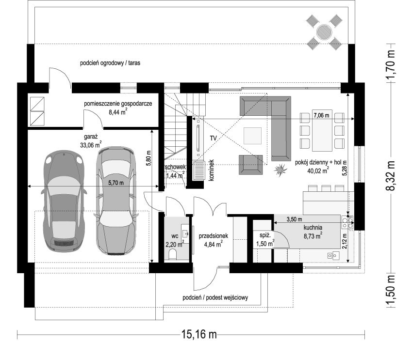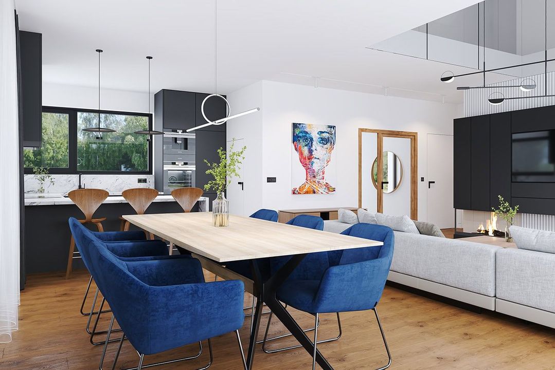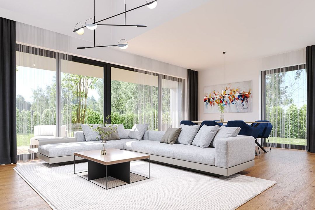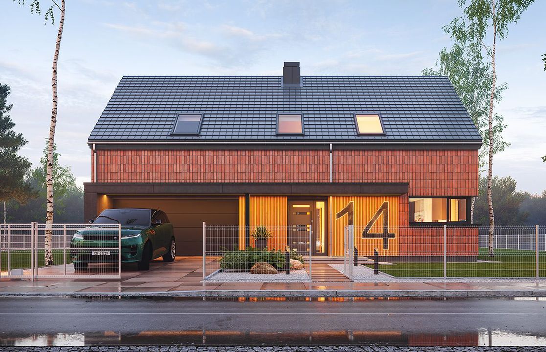 Graficzne opracowanie rzutów poglądowych widocznych na karcie projektu zostało wykonane przez Extradom.pl. Prezentowane przez Extradom.pl wizualizacje wykonane zostały przez autora projektu i należy poczytywać je jedynie za przykład i propozycję wykończenia, wizję architektoniczną autora projektu. Ostateczne wykończenie budynku może nastąpić na wiele sposobów. Szczegółowe rozwiązania zastosowane w oferowanej dokumentacji - w tym również ilość, lokalizacje i wygląd okien, drzwi, kominów - mogą w niewielkim stopniu różnić się od prezentowanej wizualizacji budynku.