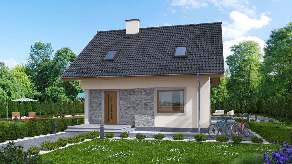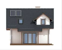 Graficzne opracowanie rzutów poglądowych widocznych na karcie projektu zostało wykonane przez Extradom.pl. Prezentowane przez Extradom.pl wizualizacje wykonane zostały przez autora projektu i należy poczytywać je jedynie za przykład i propozycję wykończenia, wizję architektoniczną autora projektu. Ostateczne wykończenie budynku może nastąpić na wiele sposobów. Szczegółowe rozwiązania zastosowane w oferowanej dokumentacji - w tym również ilość, lokalizacje i wygląd okien, drzwi, kominów - mogą w niewielkim stopniu różnić się od prezentowanej wizualizacji budynku.