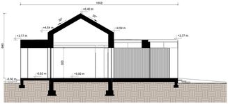 Posadowienie: ławy fundamentowe. Ściany zewnętrzne: bloczki silikatowe 24cm, Styropian 25 cm, spieki kwarcowe / drewno elewacyjne. Strop i stropodach): monolityczny żelbetowy, pokrycie papa. Konstrukcja dachu: drewniana więźba dachowa krokwiowo – jętkowa. Pokrycie dachu: blacha na rąbek stojący.