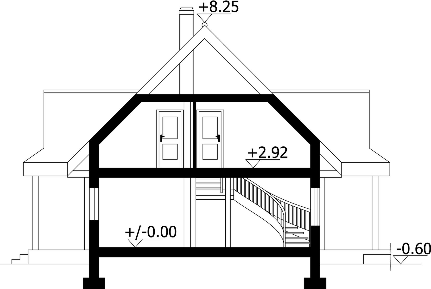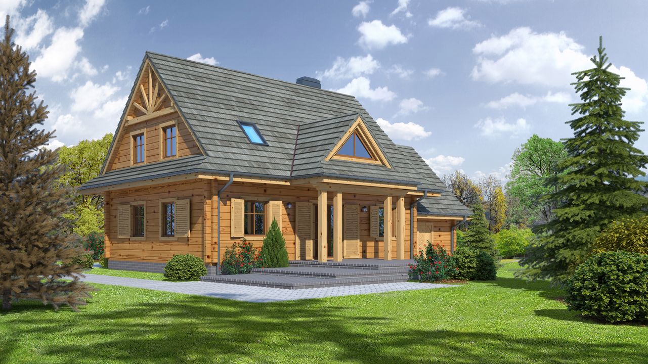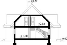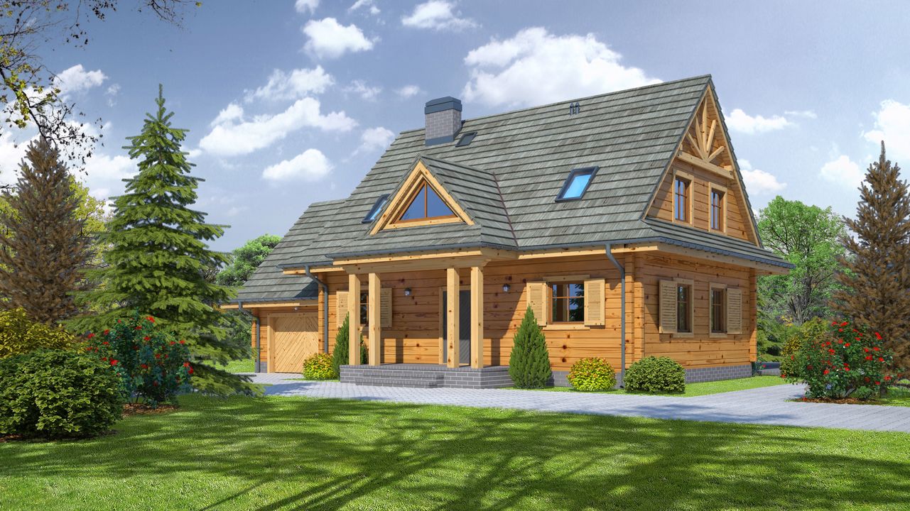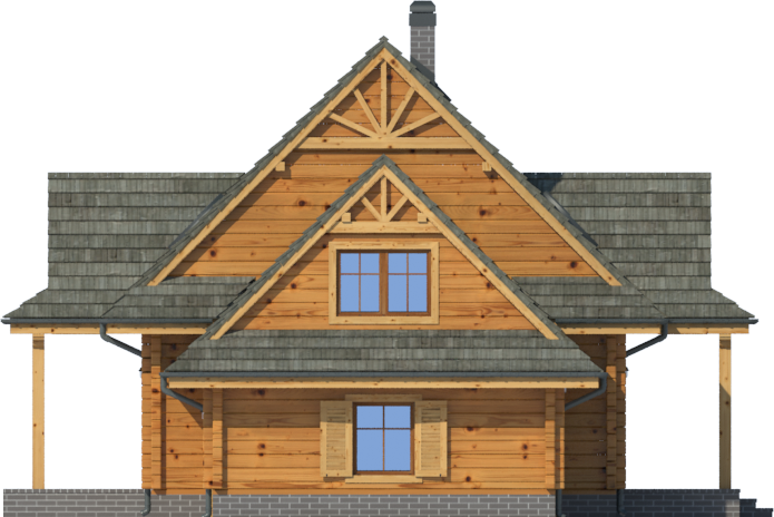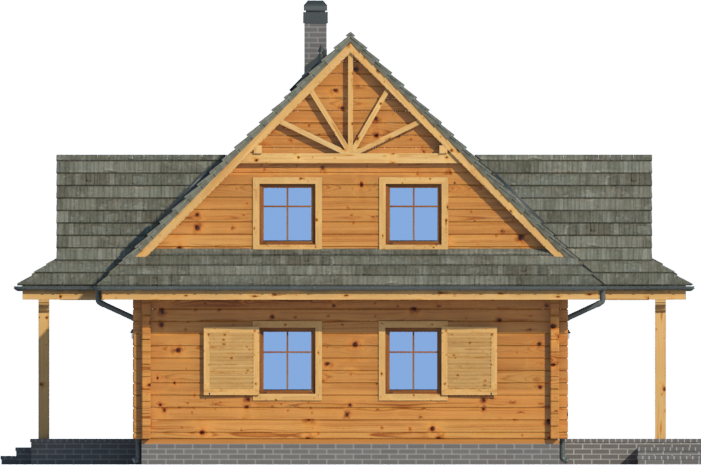 Wys. ścianki kolankowej 0.83 m. Strop: drewniany. Pokrycie dachu: dachówka gontopodobna z posypką Gerard Corona. Ściany wewnętrzne: płazy drewniane. Ściany zewnętrzne: płazy drewniane + izolacja natryskowa Icynene. Typ ogrzewania: kocioł gazowy lub kocioł na paliwo stałe.