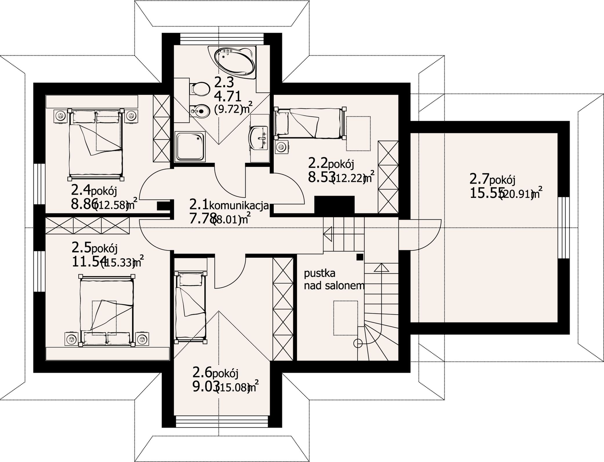 Graficzne opracowanie rzutów poglądowych widocznych na karcie projektu zostało wykonane przez Extradom.pl. Prezentowane przez Extradom.pl wizualizacje wykonane zostały przez autora projektu i należy poczytywać je jedynie za przykład i propozycję wykończenia, wizję architektoniczną autora projektu. Ostateczne wykończenie budynku może nastąpić na wiele sposobów. Szczegółowe rozwiązania zastosowane w oferowanej dokumentacji - w tym również ilość, lokalizacje i wygląd okien, drzwi, kominów - mogą w niewielkim stopniu różnić się od prezentowanej wizualizacji budynku.