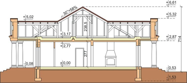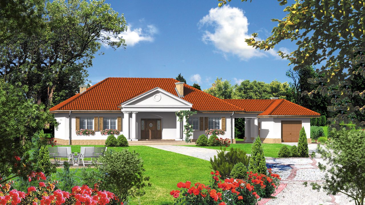 Ściany zewnętrzne: pustak ceramiczny 44 cm. Ściany nośne: pustak ceramiczny 25cm. Strop: monolityczny żelbetowy. Dach: kąt nachylenia 30°, pokrycie - dachówka ceramiczna lub betonowa.