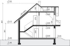 Ściany zewnętrzne: pustak 25 cm, styropian 15 cm. Ściany nośne: pustak 25 cm. Strop: monolityczny żelbetowy. Dach: kąt nachylenia 40°, pokrycie - dachówka ceramiczna lub betonowa.