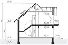 Ściany zewnętrzne: pustak 25 cm, styropian 15 cm. Ściany nośne: pustak 25 cm. Strop: monolityczny żelbetowy. Dach: kąt nachylenia 40°, pokrycie - dachówka ceramiczna lub betonowa.