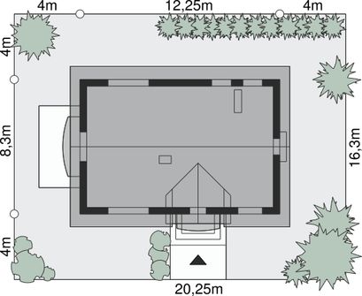 Ściany zewnętrzne: pustak 25 cm, styropian 20 cm. Ściany nośne: pustak 25 cm. Strop: monolityczny żelbetowy. Dach: kąt nachylenia 40°, pokrycie - dachówka ceramiczna lub betonowa. Instalacja solarna.