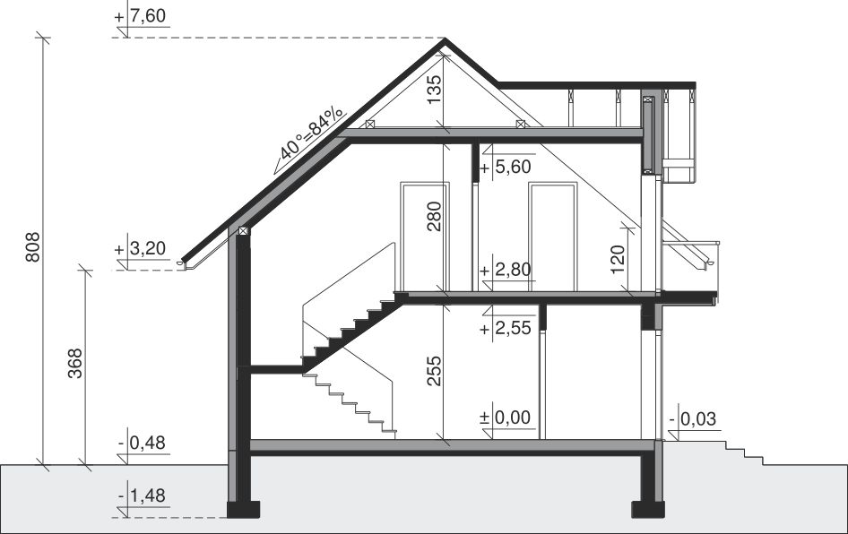 Ściany zewnętrzne: pustak 25 cm, styropian 15 cm. Ściany nośne: pustak 25 cm. Strop: monolityczny żelbetowy. Dach: kąt nachylenia 40°, pokrycie - dachówka ceramiczna lub betonowa.