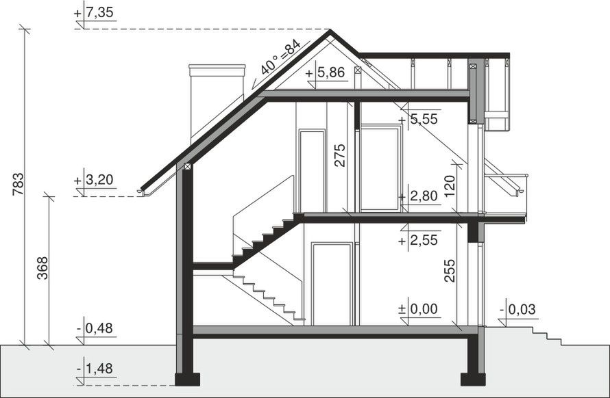 Ściany zewnętrzne: pustak 25 cm, styropian 15 cm. Ściany nośne: pustak 25 cm. Strop: monolityczny żelbetowy. Dach: kąt nachylenia 40°, pokrycie - dachówka ceramiczna lub betonowa. Instalacja solarna.