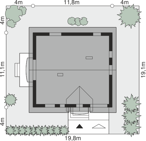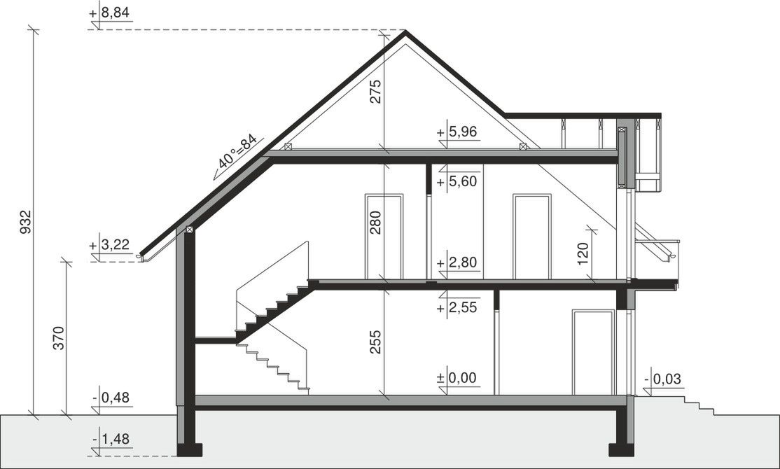 Ściany zewnętrzne: pustak 25 cm, styropian 20 cm. Ściany nośne: pustak 25 cm. Strop: monolityczny żelbetowy. Dach: kąt nachylenia 40°, pokrycie - dachówka ceramiczna lub betonowa.