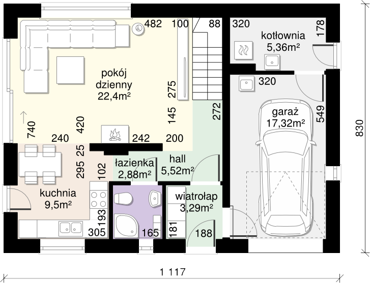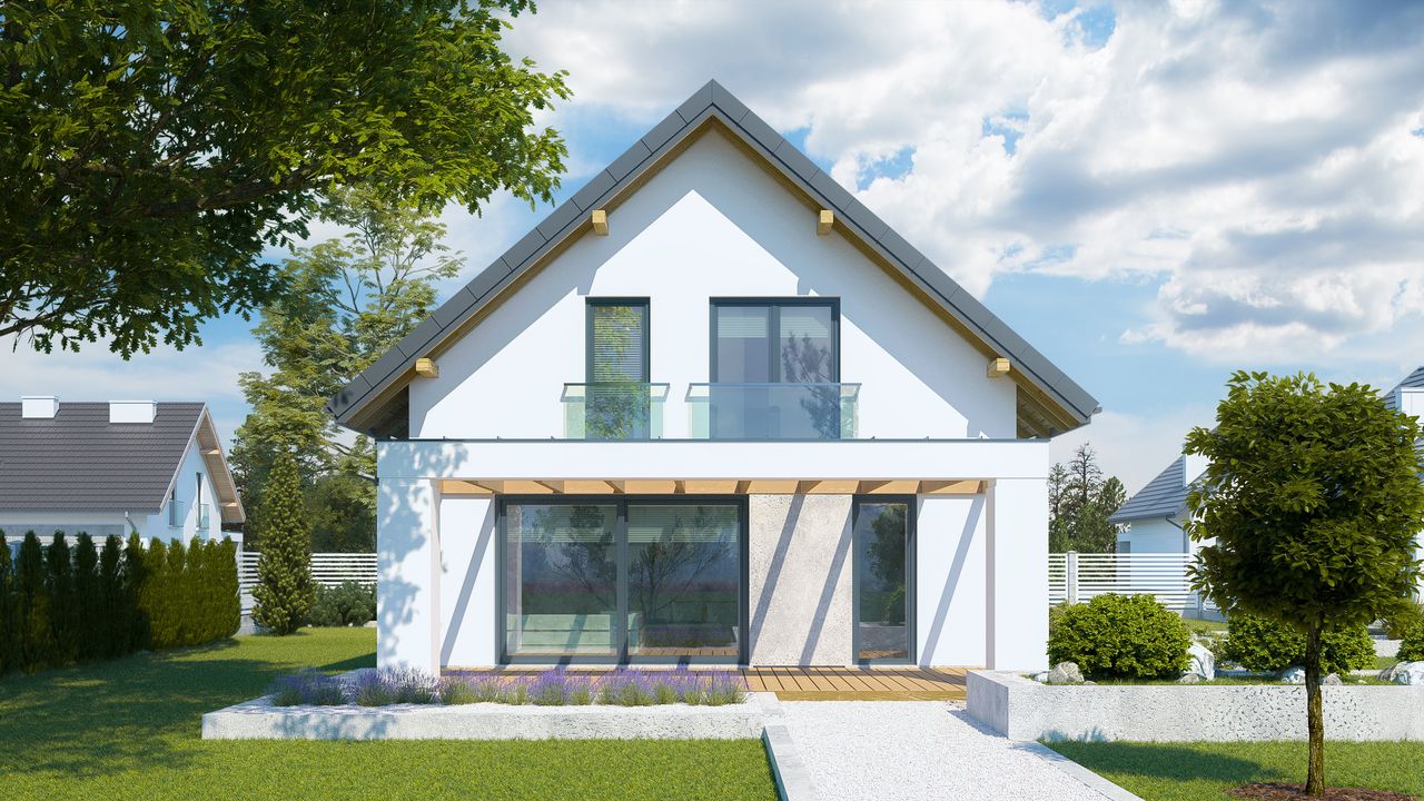 Graficzne opracowanie rzutów poglądowych widocznych na karcie projektu zostało wykonane przez Extradom.pl. Prezentowane przez Extradom.pl wizualizacje wykonane zostały przez autora projektu i należy poczytywać je jedynie za przykład i propozycję wykończenia, wizję architektoniczną autora projektu. Ostateczne wykończenie budynku może nastąpić na wiele sposobów. Szczegółowe rozwiązania zastosowane w oferowanej dokumentacji - w tym również ilość, lokalizacje i wygląd okien, drzwi, kominów - mogą w niewielkim stopniu różnić się od prezentowanej wizualizacji budynku.
