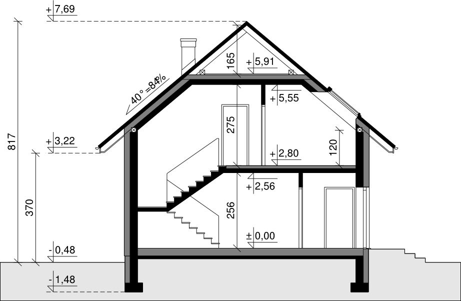 Ściany zewnętrzne: pustak 25 cm, styropian 20 cm. Ściany nośne: pustak 25 cm. Strop: monolityczny żelbetowy. Dach: kąt nachylenia 40°, pokrycie - dachówka ceramiczna lub betonowa. Instalacja solarna.