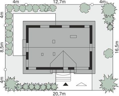 Ściany zewnętrzne: pustak 25 cm, styropian 20 cm. Ściany nośne: pustak 25 cm. Strop: monolityczny żelbetowy. Dach: kąt nachylenia 40°, pokrycie - dachówka ceramiczna lub betonowa. Instalacja solarna.