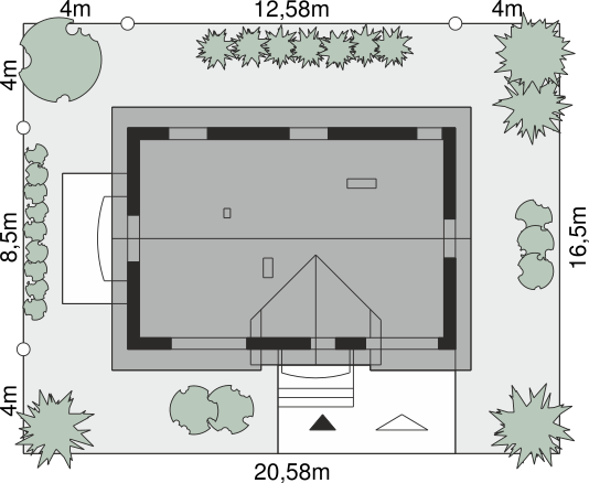 Ściany zewnętrzne: pustak 25 cm, styropian 20 cm. Ściany nośne: pustak 25 cm. Strop: monolityczny żelbetowy. Dach: kąt nachylenia 40°, pokrycie - dachówka ceramiczna lub betonowa. Instalacja solarna.