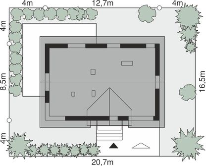 Ściany zewnętrzne: pustak 25 cm, styropian 20 cm. Ściany nośne: pustak 25 cm. Strop: monolityczny żelbetowy. Dach: kąt nachylenia 40°, pokrycie - dachówka ceramiczna lub betonowa. Instalacja solarna.