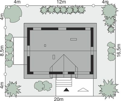 Ściany zewnętrzne: pustak 25 cm, styropian 20 cm. Ściany nośne: pustak 25 cm. Strop: monolityczny żelbetowy. Dach: kąt nachylenia 40°, pokrycie - dachówka ceramiczna lub betonowa. Instalacja solarna.