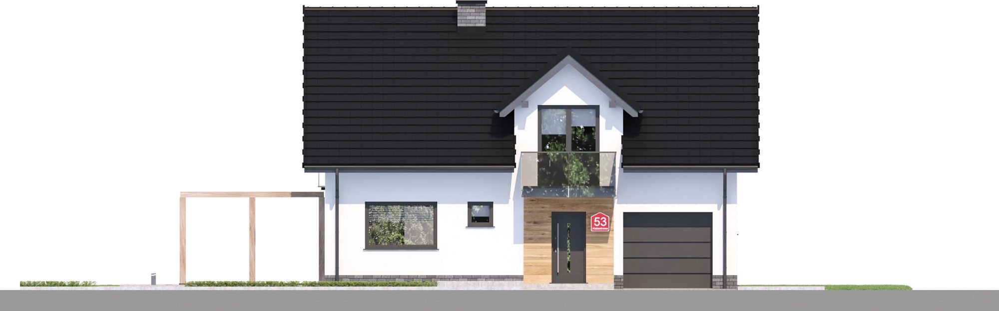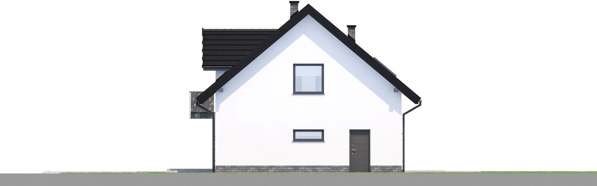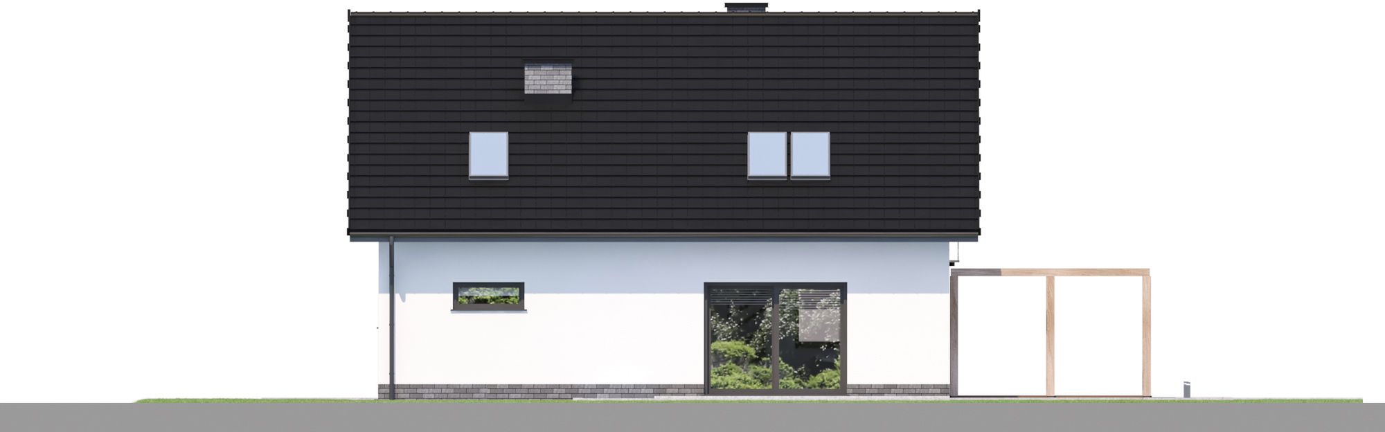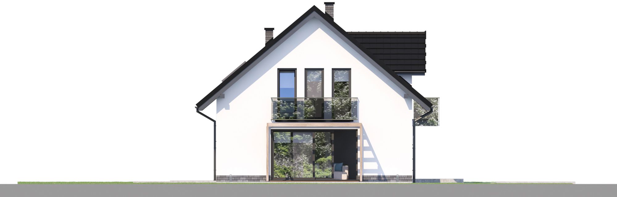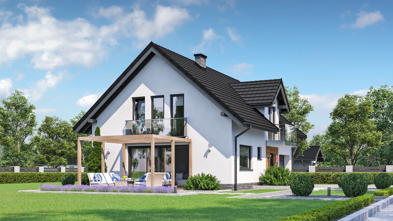 Projekt charakteryzuje się tradycyjną architekturą i zwartą bryłą, co przekłada się na prostotę i ekonomikę budowy. Klasyczny dwuspadowy dach z okapem, którego kalenica jest równoległa do drogi, został urozmaicony elegancką lukarną oraz balkonem, dodającymi całości uroku. Jednostanowiskowy garaż został zintegrowany z bryłą budynku, tworząc spójną i harmonijną kompozycję. Tradycyjny styl domu sprawia, że doskonale wpisze się on w każde otoczenie.