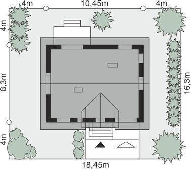 Ściany zewnętrzne: pustak 25 cm, styropian 20 cm. Ściany nośne: pustak 25 cm. Strop: monolityczny żelbetowy. Dach: kąt nachylenia 40°, pokrycie - dachówka ceramiczna lub betonowa. Instalacja solarna.
