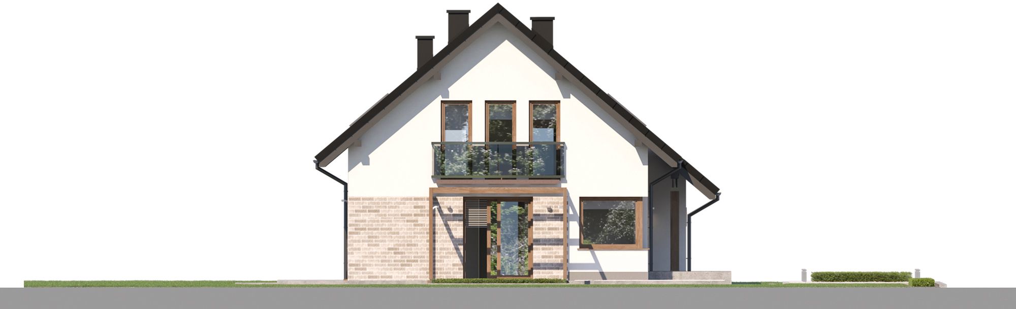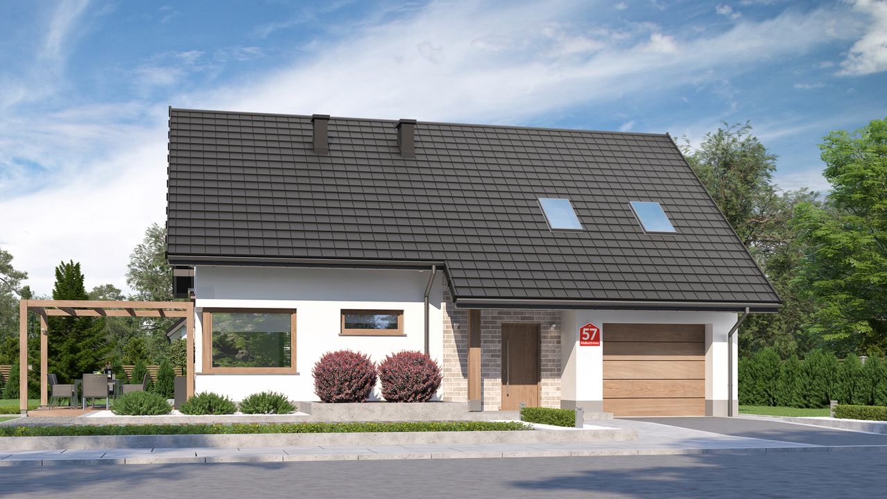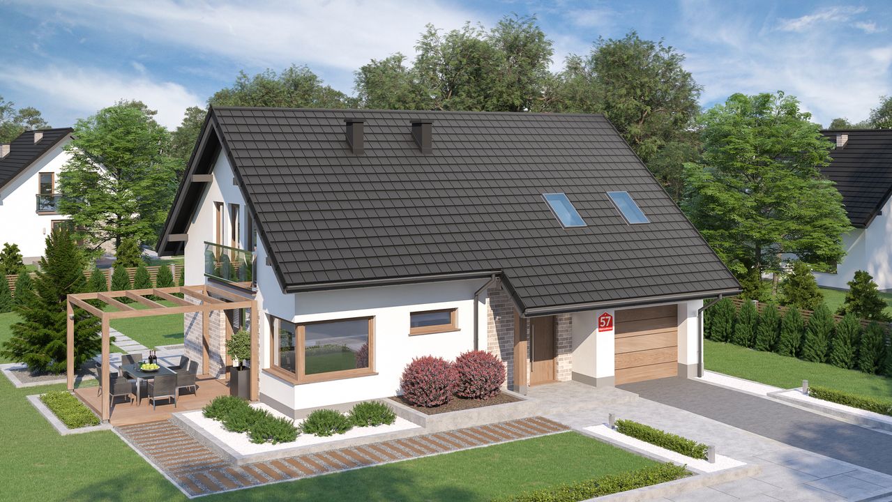 Graficzne opracowanie rzutów poglądowych widocznych na karcie projektu zostało wykonane przez Extradom.pl. Prezentowane przez Extradom.pl wizualizacje wykonane zostały przez autora projektu i należy poczytywać je jedynie za przykład i propozycję wykończenia, wizję architektoniczną autora projektu. Ostateczne wykończenie budynku może nastąpić na wiele sposobów. Szczegółowe rozwiązania zastosowane w oferowanej dokumentacji - w tym również ilość, lokalizacje i wygląd okien, drzwi, kominów - mogą w niewielkim stopniu różnić się od prezentowanej wizualizacji budynku.