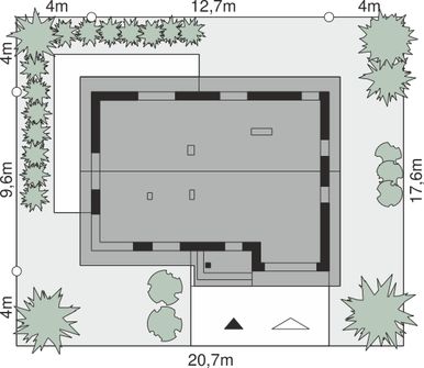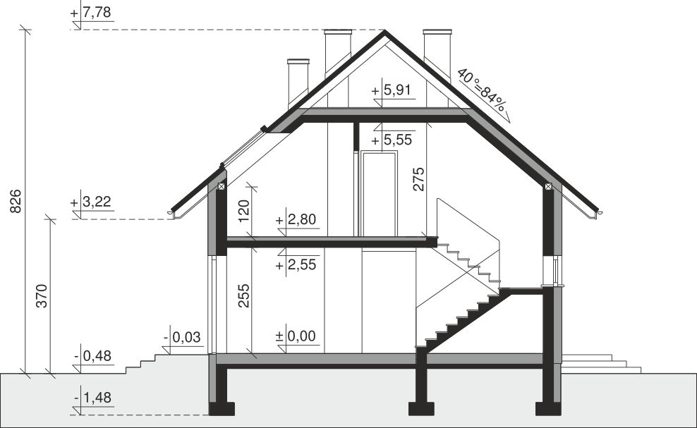 Ściany zewnętrzne: pustak 25 cm, styropian 20 cm. Ściany nośne: pustak 25 cm. Strop: monolityczny żelbetowy. Dach: kąt nachylenia 40°, pokrycie - dachówka ceramiczna lub betonowa. Instalacja solarna.