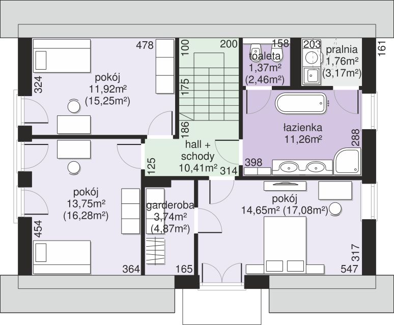 Poddasze to prywatna przestrzeń domowników, zaprojektowana z myślą o odpoczynku. Mieszczą się tu komfortowa sypialnia, która dzięki oknom dachowym i lukarnie jest doskonale doświetlona. Przy jednym z pokoi zaplanowano praktyczną garderobę. Do dyspozycji mieszkańców jest także duża, rodzinna łazienka oraz oddzielne WC, co znacznie usprawnia codzienne funkcjonowanie.