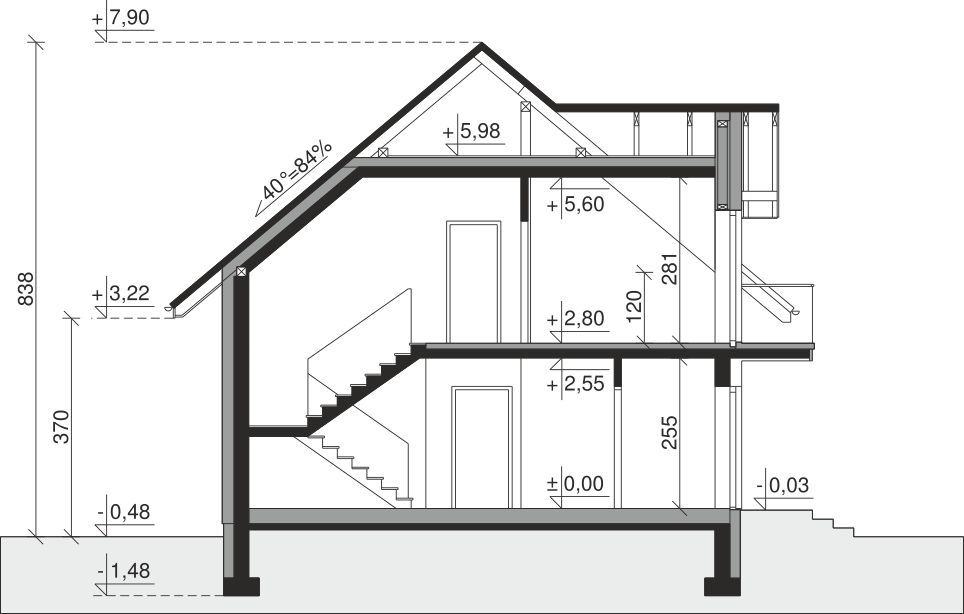 Ściany zewnętrzne: pustak 25 cm, styropian 20 cm. Ściany nośne: pustak 25 cm. Strop: monolityczny żelbetowy. Dach: kąt nachylenia 40°, pokrycie - dachówka ceramiczna lub betonowa. Instalacja solarna.