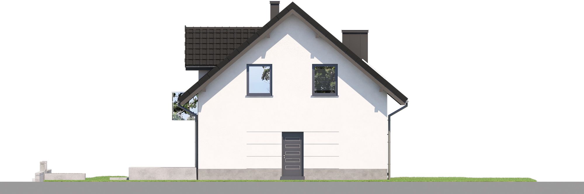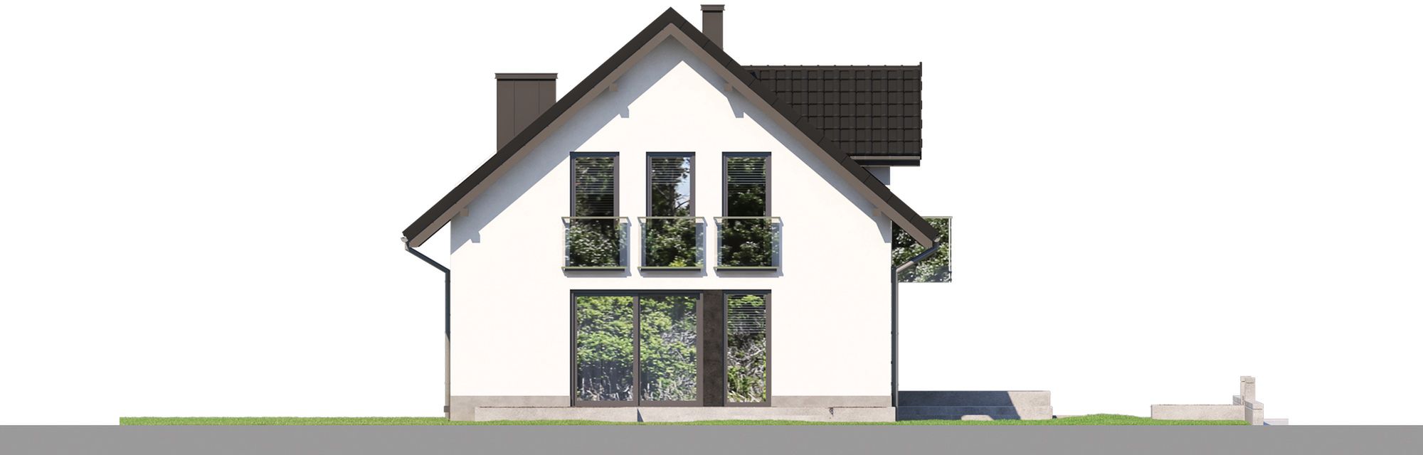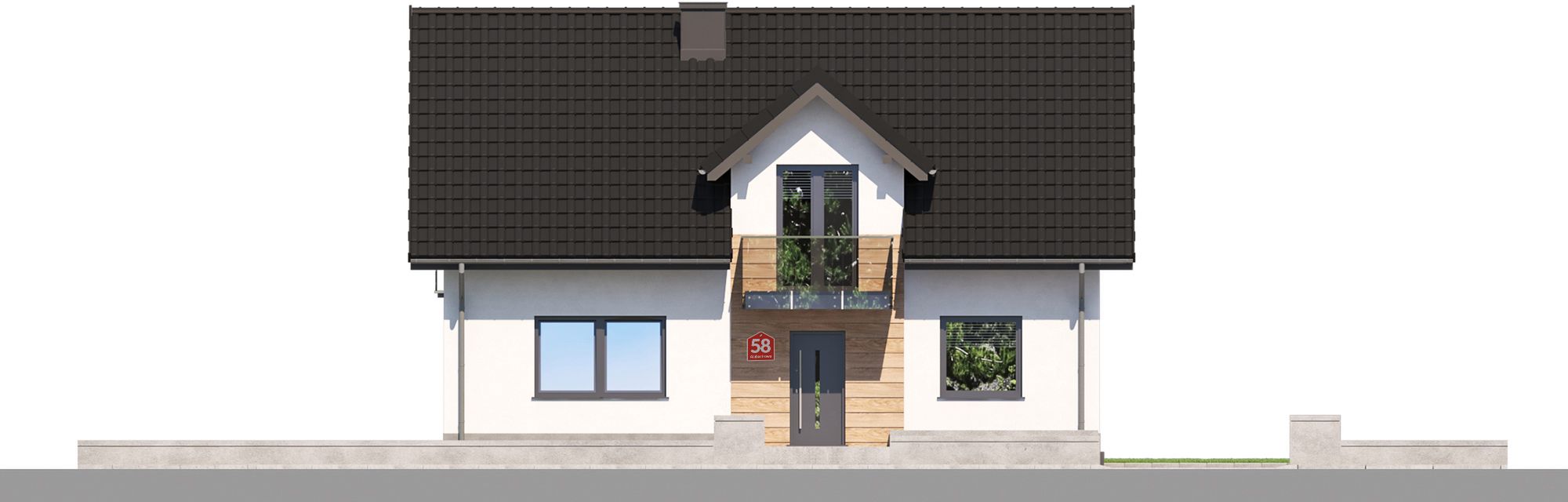 Projekt charakteryzuje się klasyczną bryłą na planie prostokąta, zwieńczoną dwuspadowym dachem. To ponadczasowe i ekonomiczne w realizacji rozwiązanie, które doskonale wpisuje się w każdy krajobraz. Uroku tradycyjnej formie dodaje elegancka lukarna oraz balkon, które nie tylko zdobią elewację, ale również doświetlają i powiększają przestrzeń poddasza. Styl budynku podkreśla klasyczny dach z okapem, tworząc spójną i harmonijną całość.