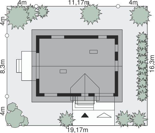 Ściany zewnętrzne: pustak 25 cm, styropian 20 cm. Ściany nośne: pustak 25 cm. Strop: monolityczny żelbetowy. Dach: kąt nachylenia 40°, pokrycie - dachówka ceramiczna lub betonowa. Instalacja solarna.
