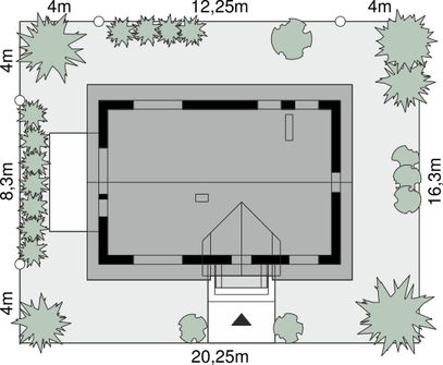 Ściany zewnętrzne: pustak 25 cm, styropian 20 cm. Ściany nośne: pustak 25 cm. Strop: monolityczny żelbetowy. Dach: kąt nachylenia 40°, pokrycie - dachówka ceramiczna lub betonowa. Instalacja solarna.