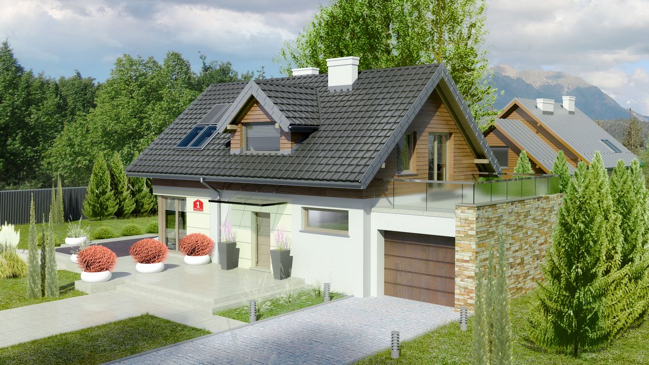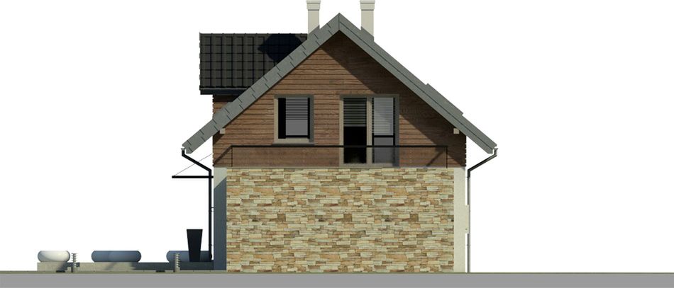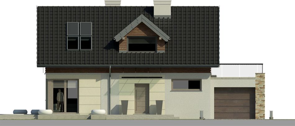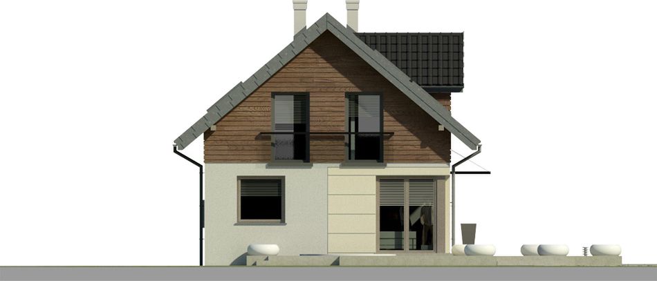 Graficzne opracowanie rzutów poglądowych widocznych na karcie projektu zostało wykonane przez Extradom.pl. Prezentowane przez Extradom.pl wizualizacje wykonane zostały przez autora projektu i należy poczytywać je jedynie za przykład i propozycję wykończenia, wizję architektoniczną autora projektu. Ostateczne wykończenie budynku może nastąpić na wiele sposobów. Szczegółowe rozwiązania zastosowane w oferowanej dokumentacji - w tym również ilość, lokalizacje i wygląd okien, drzwi, kominów - mogą w niewielkim stopniu różnić się od prezentowanej wizualizacji budynku.