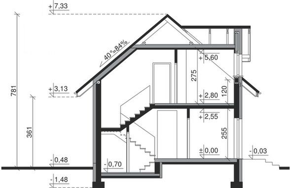 Ściany zewnętrzne: pustak 25 cm, styropian 15 cm. Ściany nośne: pustak 25 cm. Strop: monolityczny żelbetowy. Dach: kąt nachylenia 40°, pokrycie - dachówka ceramiczna lub betonowa.
