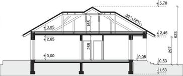 Ściany zewnętrzne: pustak 44 cm, pustak 30 cm. Ściany nośne: pustak 25 cm. Strop: monolityczny żelbetowy. Dach: kąt nachylenia 30°, pokrycie - dachówka ceramiczna lub betonowa.