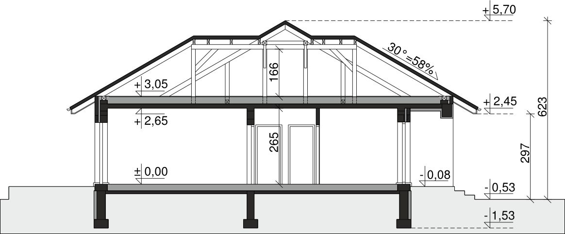 Ściany zewnętrzne: pustak 44 cm, pustak 30 cm. Ściany nośne: pustak 25 cm. Strop: monolityczny żelbetowy. Dach: kąt nachylenia 30°, pokrycie - dachówka ceramiczna lub betonowa.