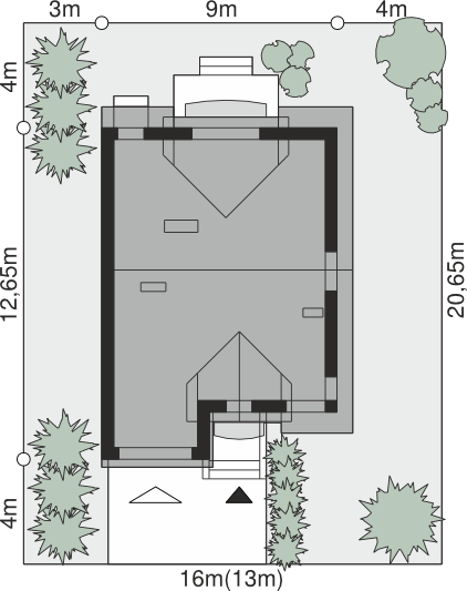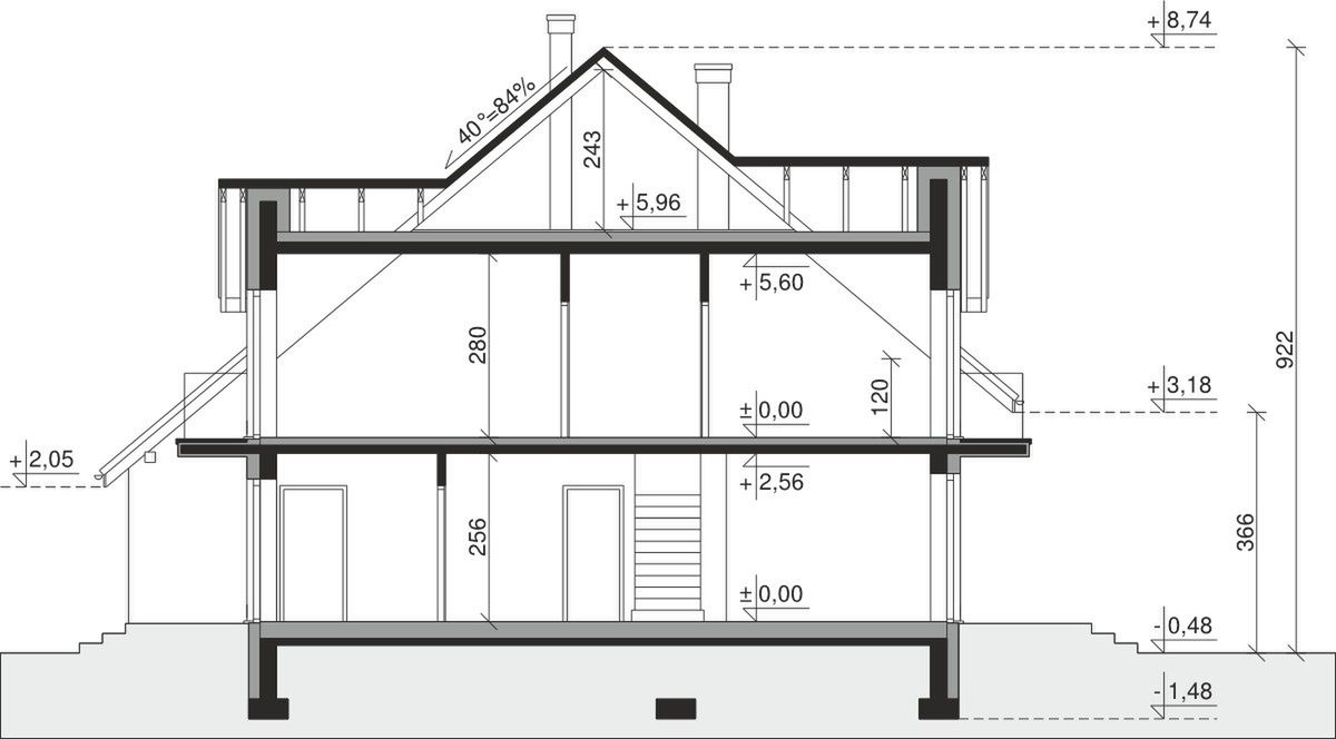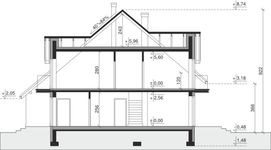 Ściany zewnętrzne: pustak 25 cm, styropian 20 cm. Ściany nośne: pustak 25 cm. Strop: monolityczny żelbetowy. Dach: kąt nachylenia 40°, pokrycie - dachówka ceramiczna lub betonowa.