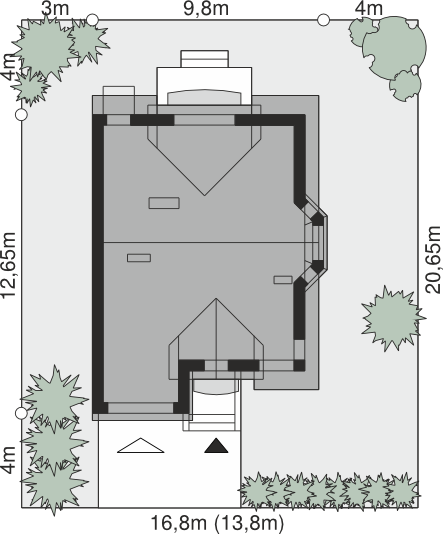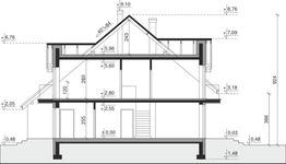 Ściany zewnętrzne: pustak 25 cm, styropian 20 cm. Ściany nośne: pustak 25 cm. Strop: monolityczny żelbetowy. Dach: kąt nachylenia 40°, pokrycie - dachówka ceramiczna lub betonowa.