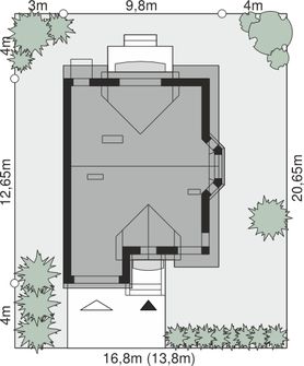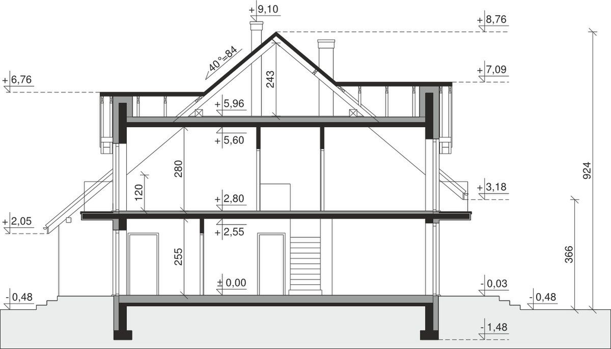Ściany zewnętrzne: pustak ceramiczny 25 cm, styropian 20 cm. Ściany nośne: pustak ceramiczny 25cm. Strop: monolityczny żelbetowy. Dach: kąt nachylenia 40°, pokrycie - dachówka ceramiczna lub betonowa.