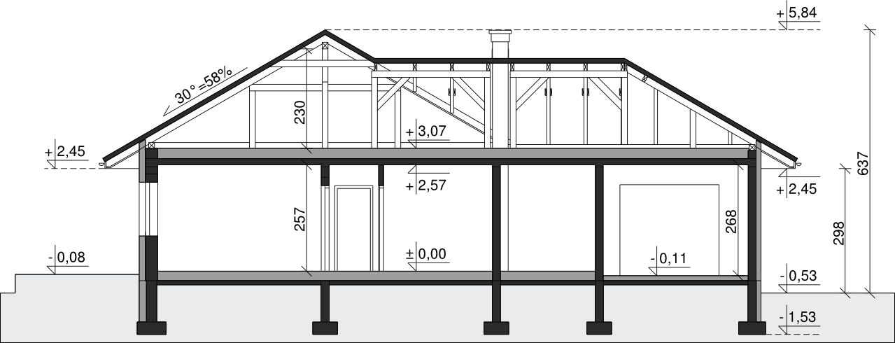 Ściany zewnętrzne: pustak 30 cm, styropian 20 cm. Ściany nośne: pustak 19 cm. Strop: monolityczny żelbetowy. Dach: kąt nachylenia 30°, pokrycie - dachówka ceramiczna lub betonowa. Instalacja solarna.